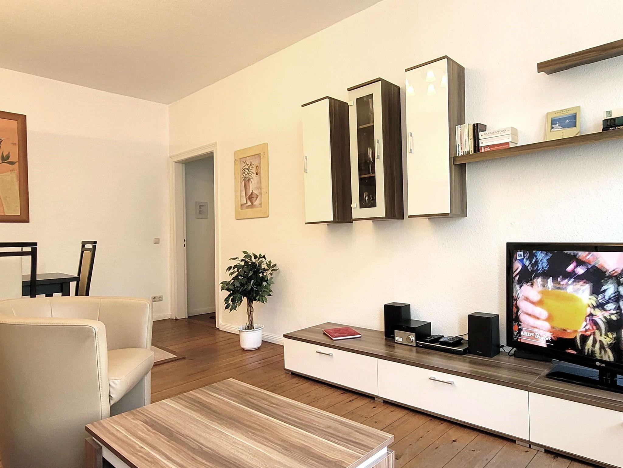 Modern eingerichtete Ferienwohnung für 2 Personen. Nach Absprache können 2 weitere Personen auf dem Schlafsofa im Wohnzimmer übernachten. Im Wohnzimmer befinden sich ebenfalls eine gemütliche Sitzecke sowie ein Essbereich. Ihnen stehen ein 42 ? Flachbildfernseher im Wohnzimmer zur Verfügung und ein weiterer, etwas kleinerer Flatscreen im Schlafzimmer. Das Schlafzimmer ist zusätzlich mit Doppelbett und großem Schlafzimmerschrank ausgestattet.
