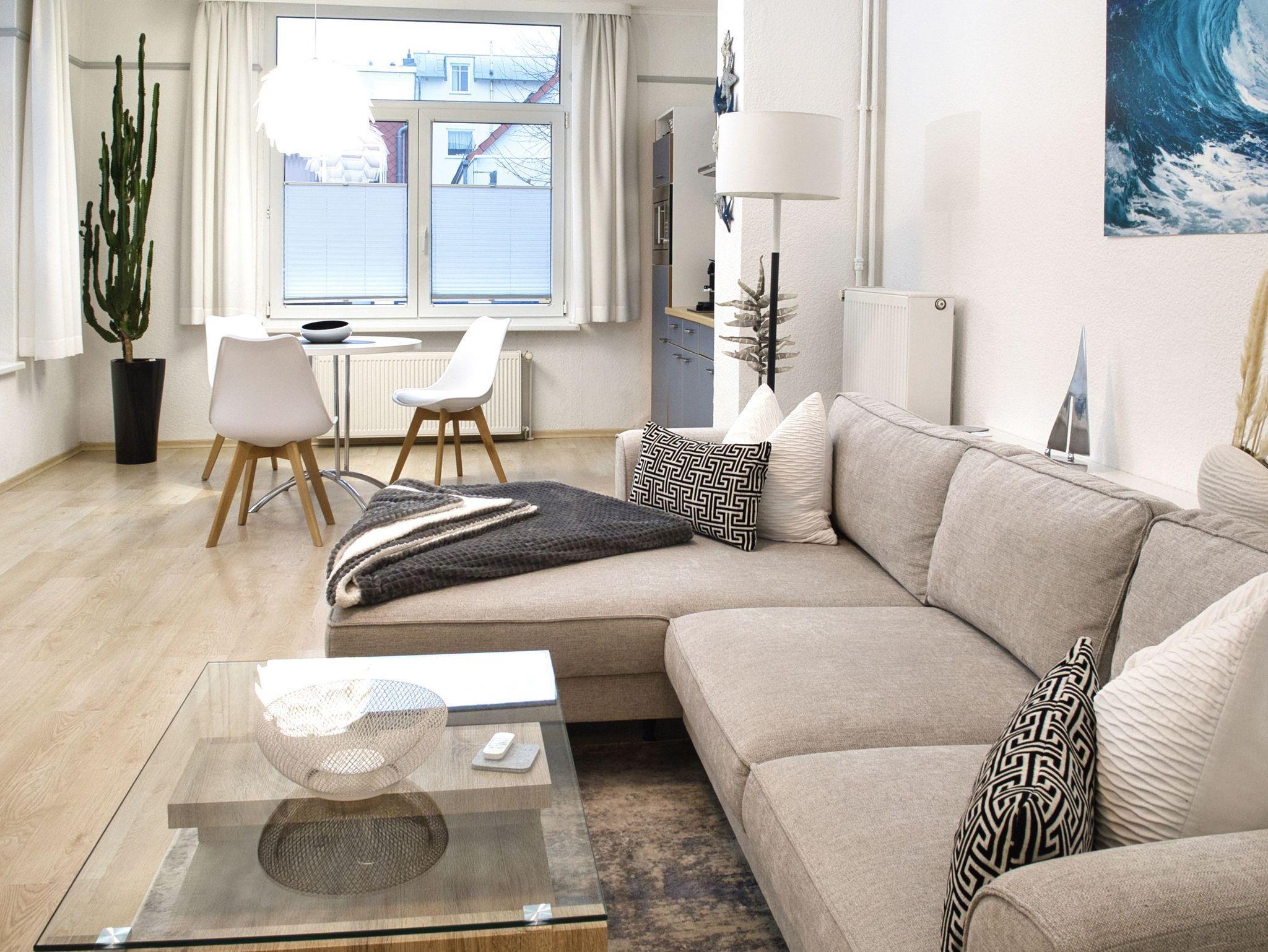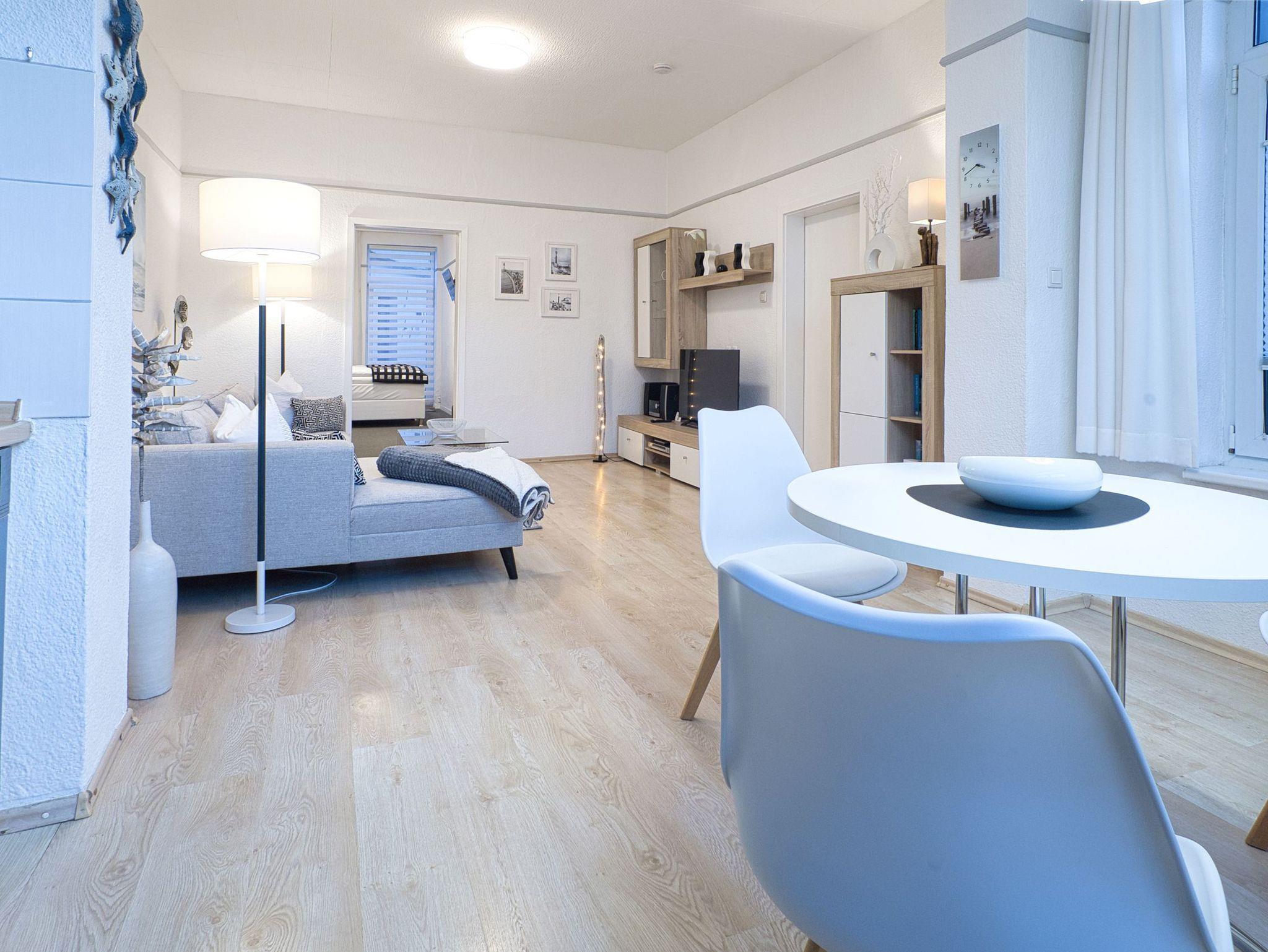 Unsere helle, moderne 75 qm große Ferienwohnung Ferienhaus der kurzen Wege bietet Ihnen diverse Möglichkeiten Ihren Urlaub in optimaler Lage zu verbringen. Sie ist eine Oase der Ruhe, mit schöner Terrasse zur Entspannung. Die Wohnung ist komfortabel, hell und hochwertig eingerichtet. Die ausgestattete Küchenzeile grenzt an den Wohn / Essbereich und bietet ihnen alles, was sie benötigen. Hier finden sie: Ceranfeld , Geschirrspülmaschine, Wasserkocher, Toaster, Kaffeemaschine, Kombimikrowelle, Delonghi Nespresso Maschine und natürlich genügend Geschirr und Besteck. Der Esstisch lädt schon am Morgen zum gemütlichen Frühstück ein. Ein sep. Schlafzimmer ist mit einem Doppelbett und rückengerechte Wohlfühlmatratzen, einem geräumigen Kleiderschrank und einem 2. Flatscreen TV ausgestattet. Im Wohnzimmer befindet sich eine moderne Sofalandschaft. Nach einem langen Strandtag finden sie hier Erholung und können endlich die Beine hochlegen und sich mit dem großen Flatscreen TV wie zu Hause fühlen. Vom Schlafzimmer aus gelangen sie auf die Terrasse mit dem idyllischen Garten (Alleinnutzung). Ein großes Bad mit Badewanne und Dusche sorgt für den richtigen Erholungs- und Wellnessfaktor. Waschmaschine und elektrischer Wäschetrockner sind vorhanden. Im Haushaltsraum finden sie Bügelbrett, Bügeleisen, Standwäschetrockner und vieles mehr. WLAN können sie bei uns kostenlos nutzen.