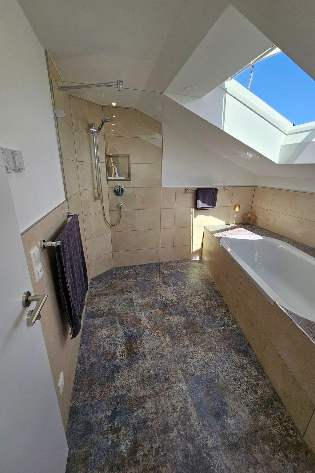 - Walk-in shower, exclusive Italian large-format bathroom tiles, large