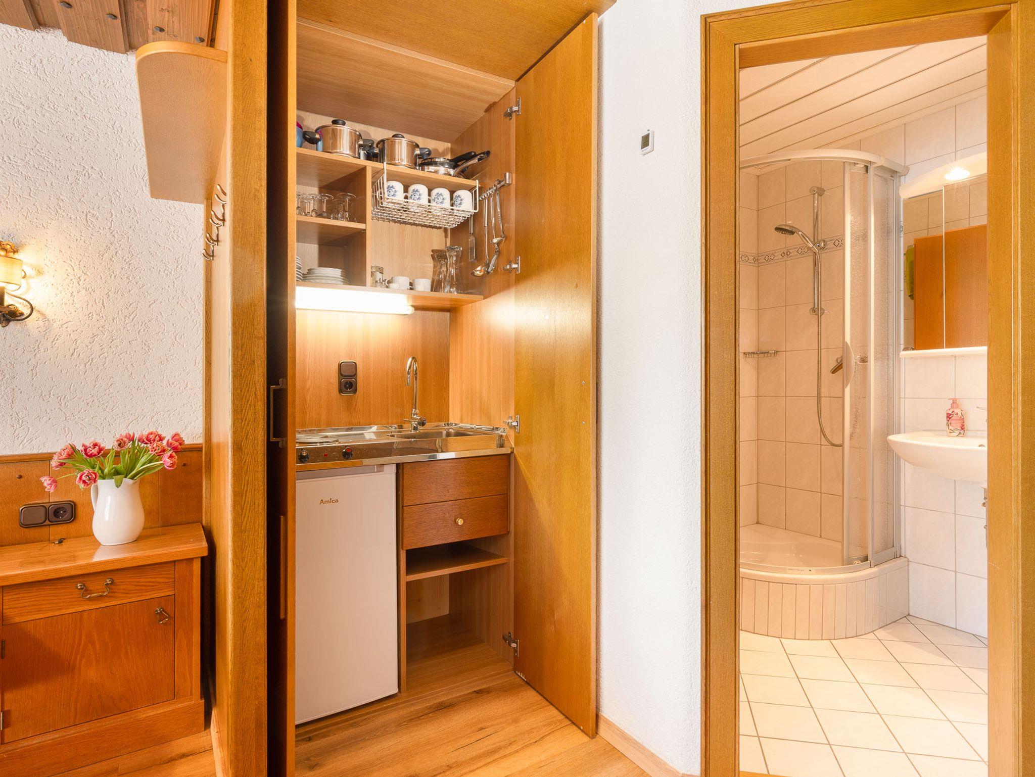 Gemütliches Apartment mit Kabel-Flach-TV, CD-Radio-Wecker und kleiner Einbauküche mit Mikrowelle. Bequeme Sitzecke und Doppelbetten in Komforthöhe. Modernes Badezimmer mit Dusche-WC, Fön und Kosmetik. Freier Bergblick vom großen Südwestbalkon oder von der Südwestterrasse mit Strandkorb. Garage oder Carport auf Anfrage. Nichtraucher-Apartment.