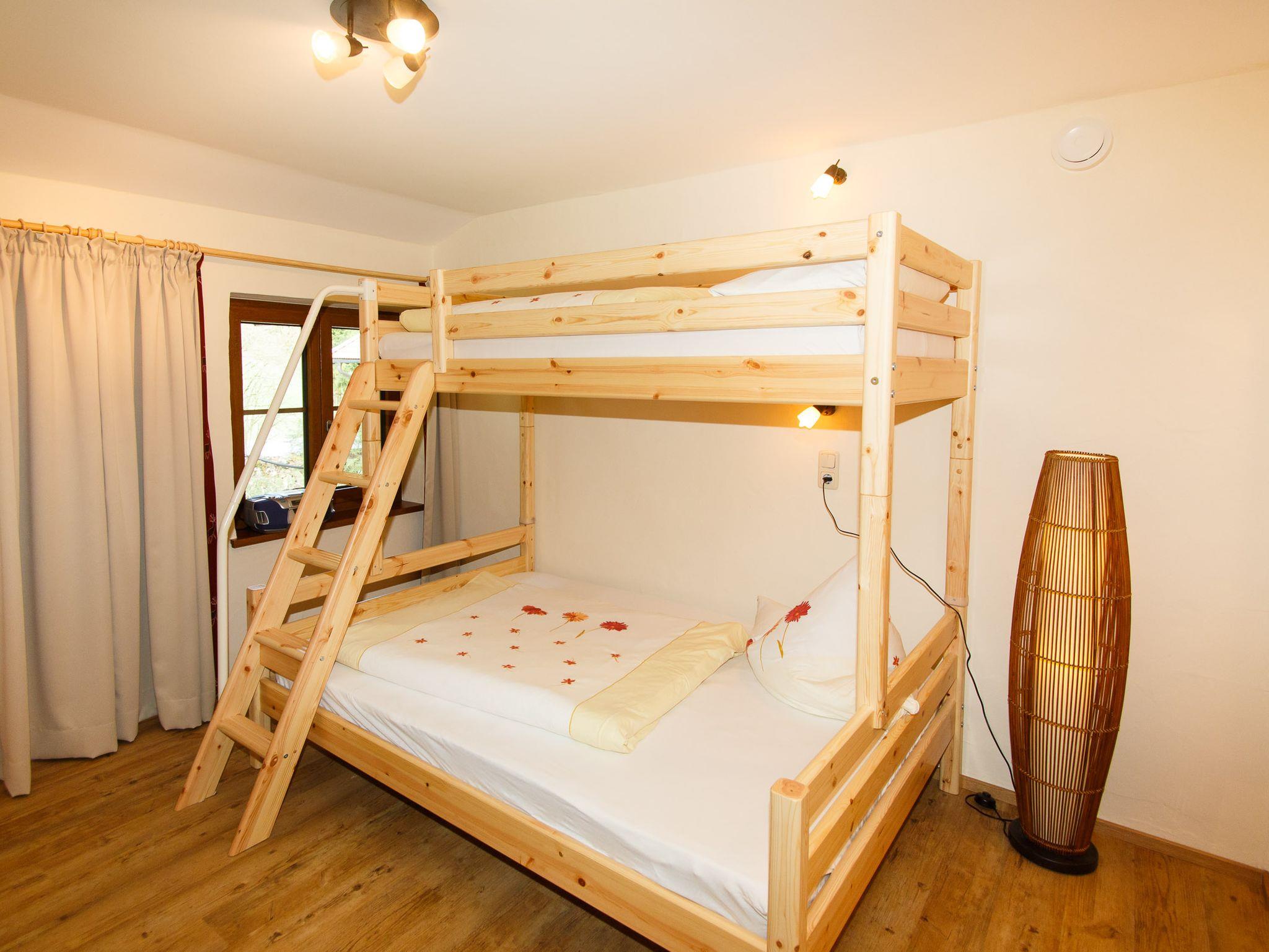 Großzügige Familien-Ferienwohnung für 4 Personen mit 89 qm Wohnfläche im Haupthaus 2.OG gelegen mit Südbalkon. 1 Schlafzimmer mit Himmelbett, ein weiteres Schlafzimmer als Kinderzimmer mit Etagenbett (unteres Bett 1,40 breit, oben 90 cm). Für eine 5. Person kann sowohl im Kinderzimmer als auch im Elternschlafzimmer ein Zustellbett oder Reisebett aufgestellt werden. Vollausgestattete Küche (Backofen, Ceranfeld, Geschirrspüler, Kühlschrank mit Gefrierfach und den nötigen Kleingeräten), großes Badezimmer. Moderne Lüftungsanlage, kein Teppichboden.