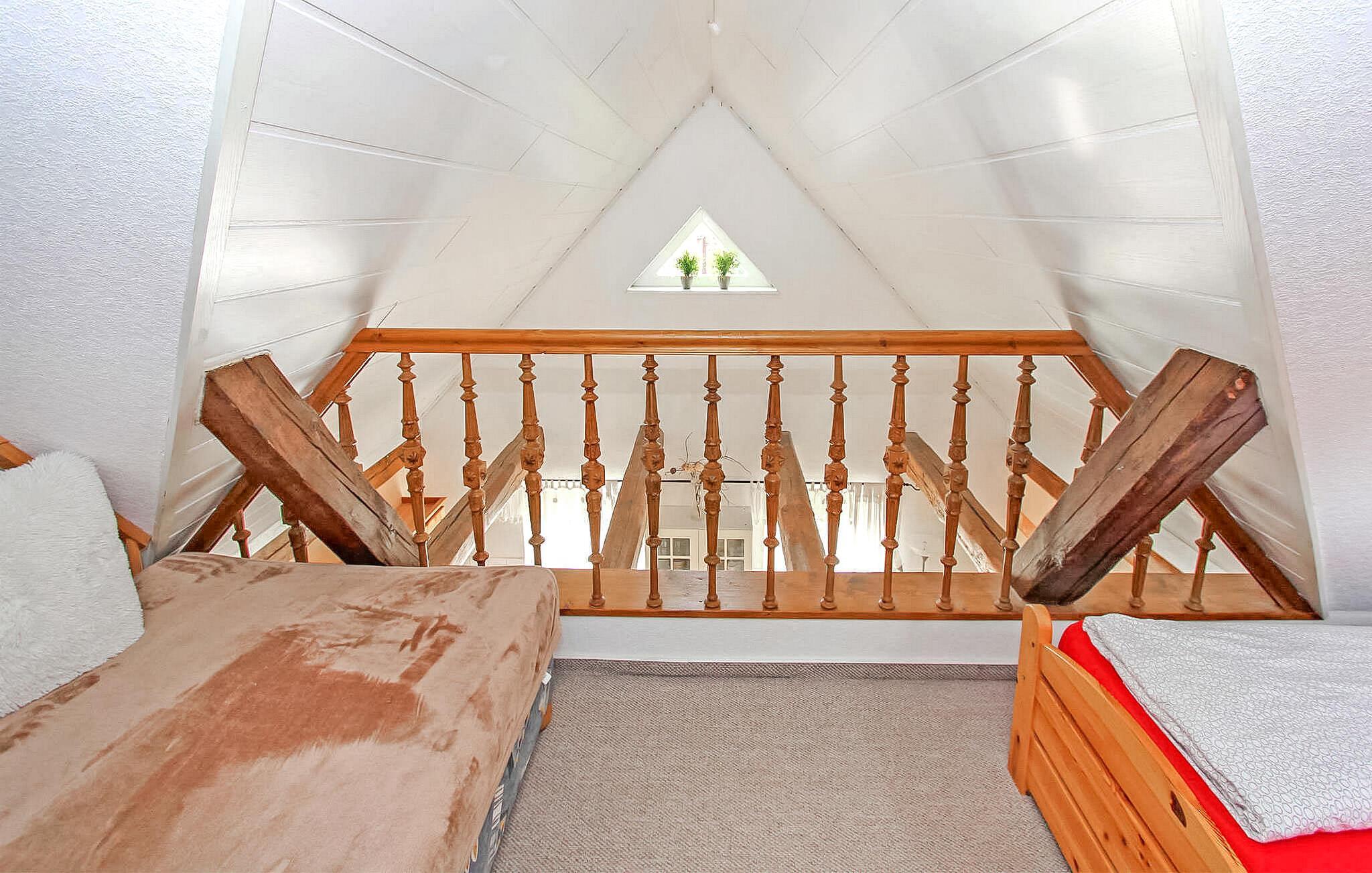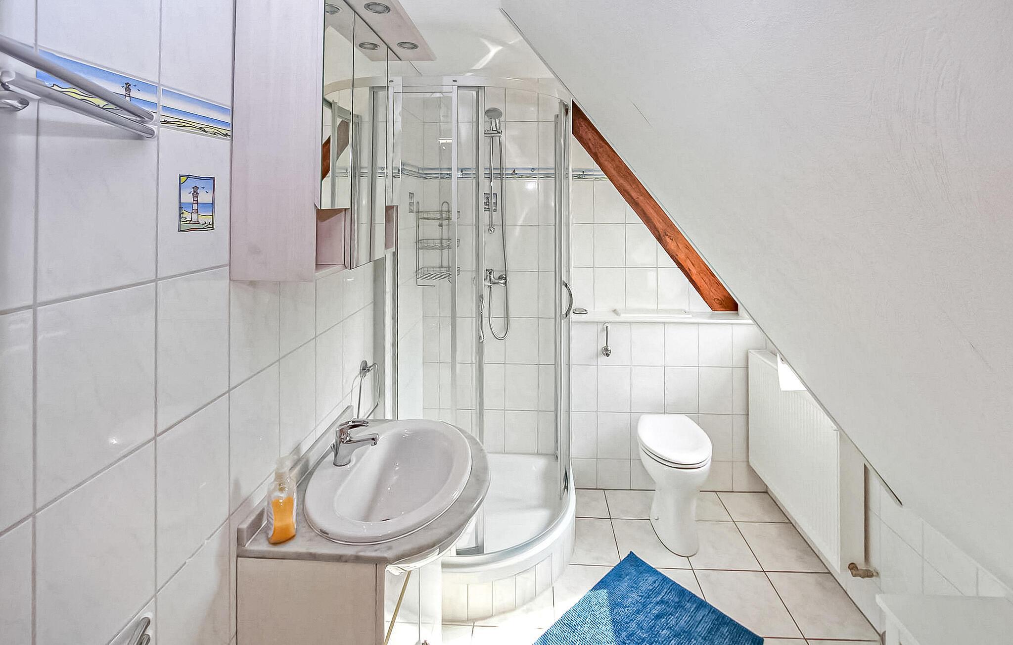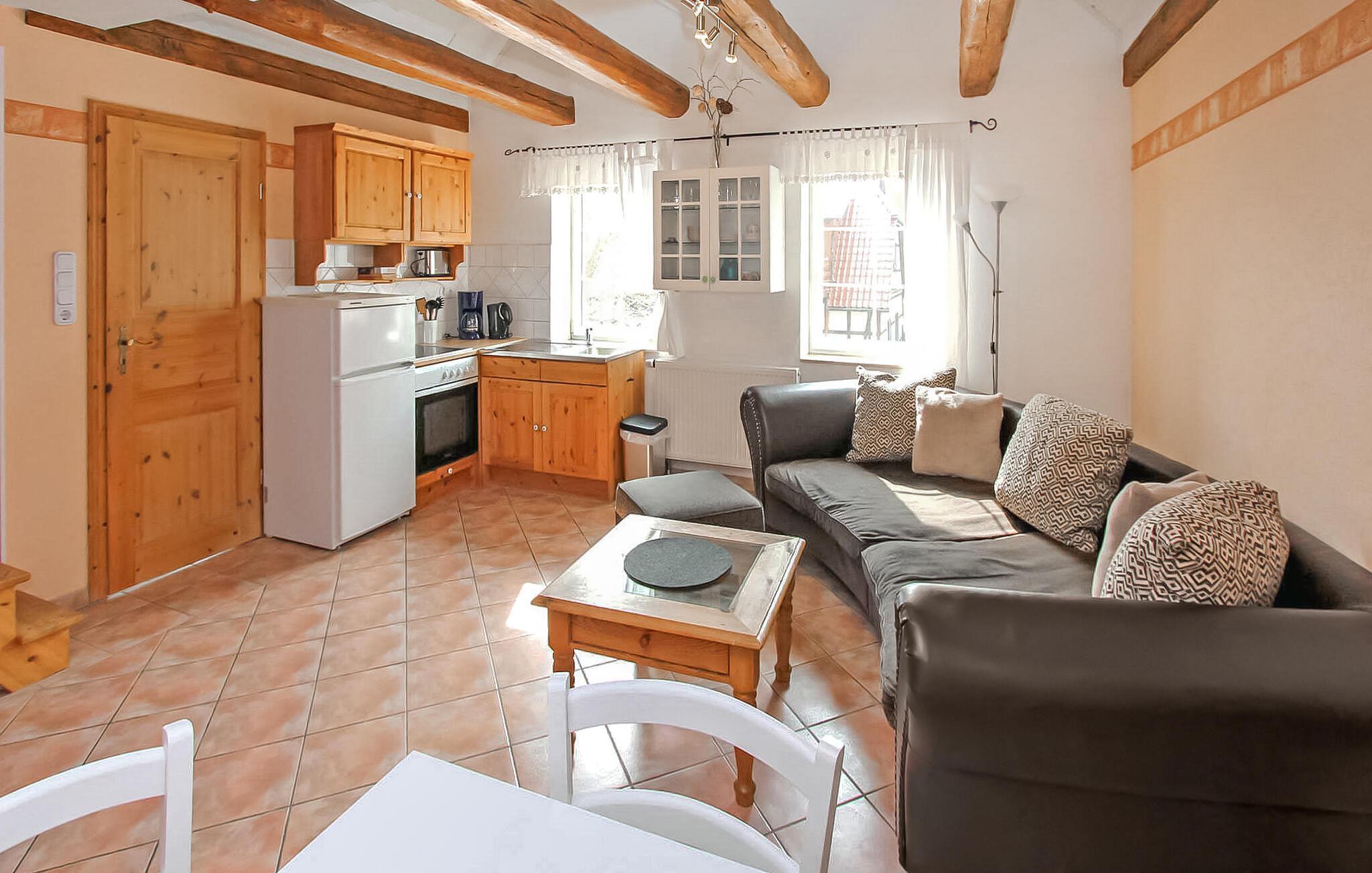 Semesterlägenheten för max. 4 personer ligger separat på övervåningen i gästhuset. Den är utrustad med ett vardagsrum (stoppade möbler, platt-TV, radio), ett kök i öppen planlösning (matplats, elspis med ugn, kylskåp med frysfack, diverse köksutrustning), ett sovrum med dubbelsäng, ett öppet sovgalleri (via branta trappor) med 2 enkelsängar och en bäddsoffa samt ett badrum med dusch/WC.