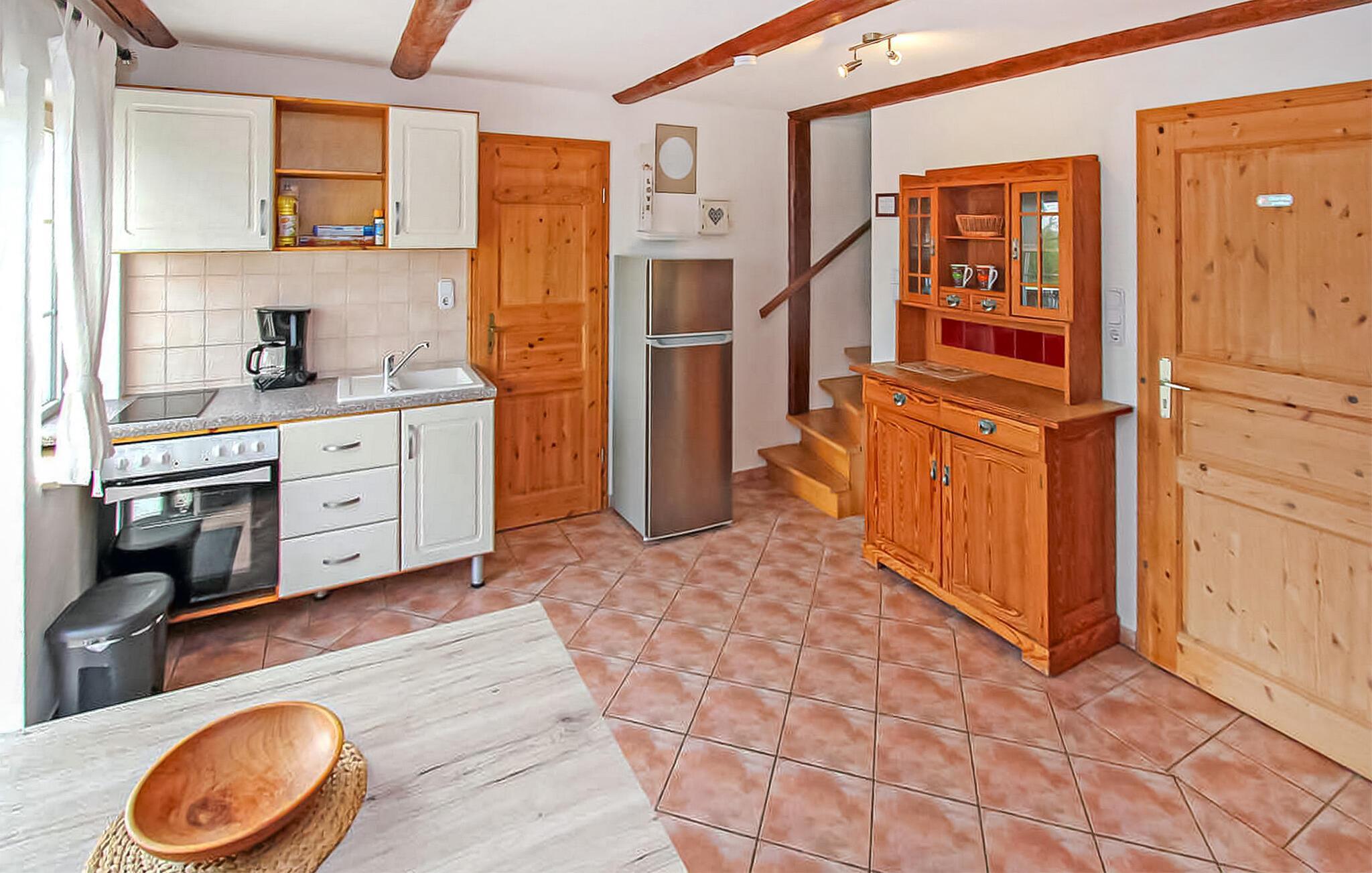 Semesterlägenheten för max. 3 personer ligger separat på övervåningen i gästhuset. Den är utrustad med ett vardagsrum (stoppade möbler, platt-TV, radio), ett kök i öppen planlösning (matplats, elspis med ugn, kylskåp med frysfack, diverse köksutrustning), ett sovrum med en enkelsäng, ett sovrum i öppen planlösning (via trappa) med en dubbelsäng och ett badrum med dusch/WC. Det finns också en härlig balkong med sittplatser, solstolar och utsikt över Müritz.