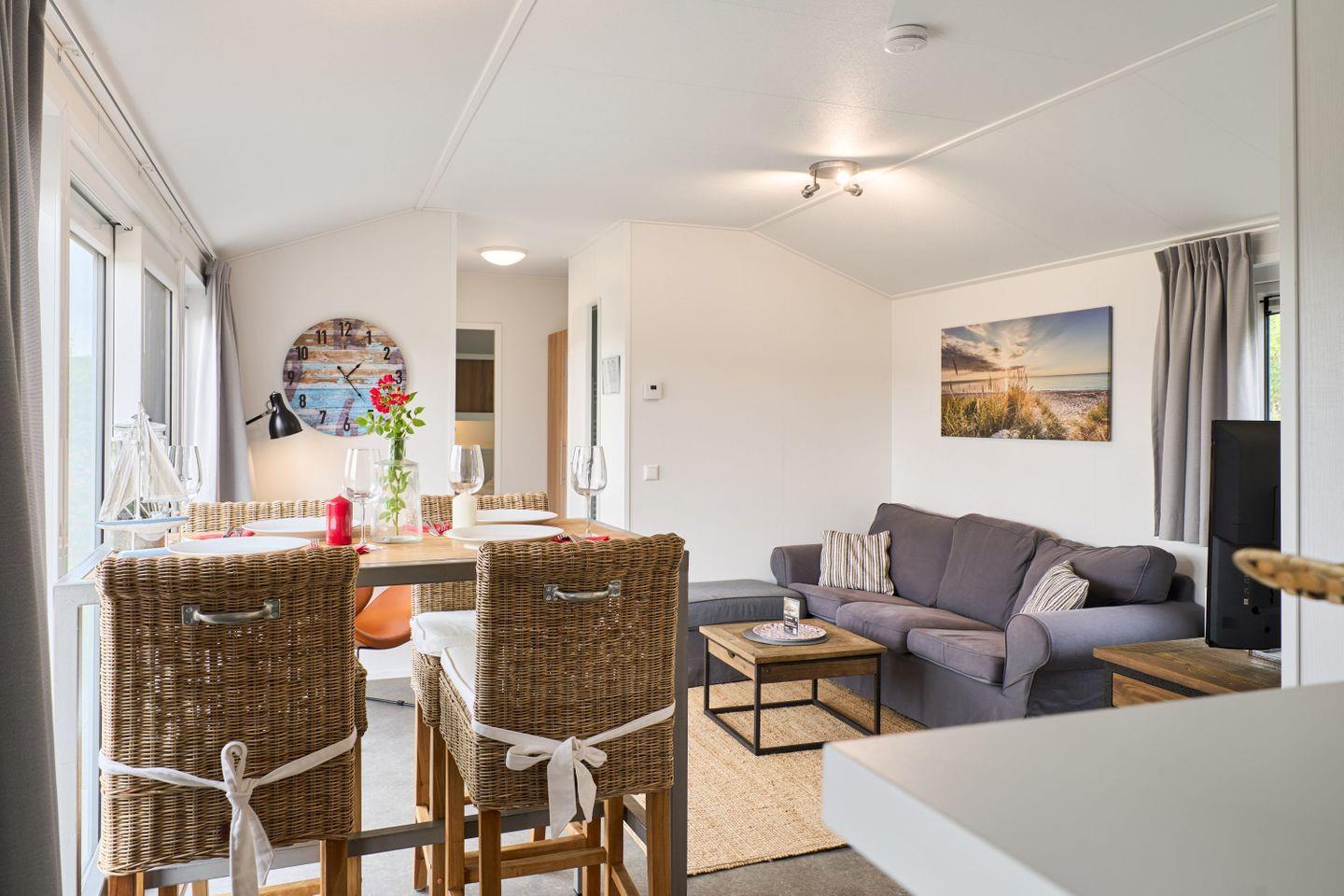 Die moderne, offene Küche grenzt unmittelbar an den Wohnbereich an und ist voll ausgestattet: Ein Backofen, Herd, Kühlschrank mit Gefrierfach, Spülmaschine, Wasserkocher, Kaffeemaschine, Toaster sowie umfassendes Geschirr, Besteck und Küchenutensilien stehen zur Verfügung. Es gibt einen Esstisch, an dem Sie Ihre Mahlzeiten gemeinsam genießen können. Für die Vorratshaltung können Sie in den nur 4000 Meter entfernten Einkaufsmöglichkeiten alles Nötige erwerben. Frische Brötchen lassen sich bequem per Brötchenservice bestellen.