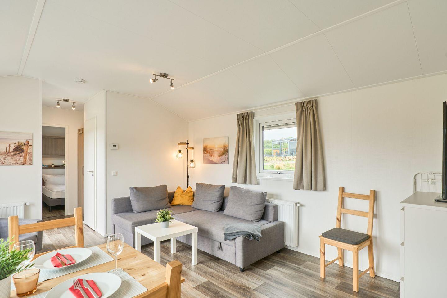 Die moderne, offene Küche lädt dazu ein, Mahlzeiten gemeinsam zuzubereiten. Zur Ausstattung gehören ein Herd mit Backofen, Kühlschrank mit Gefrierfach, Spülmaschine, Kaffeemaschine, Wasserkocher, Toaster sowie ausreichend Geschirr und Besteck. Ein Esstisch und ein gemütliches Sofa runden den Wohnbereich ab. Für zeitgemäßen Komfort sorgen WLAN, Internetzugang und ein Flachbild-TV. Sämtliche Fenster sind mit Sichtschutz ausgestattet.