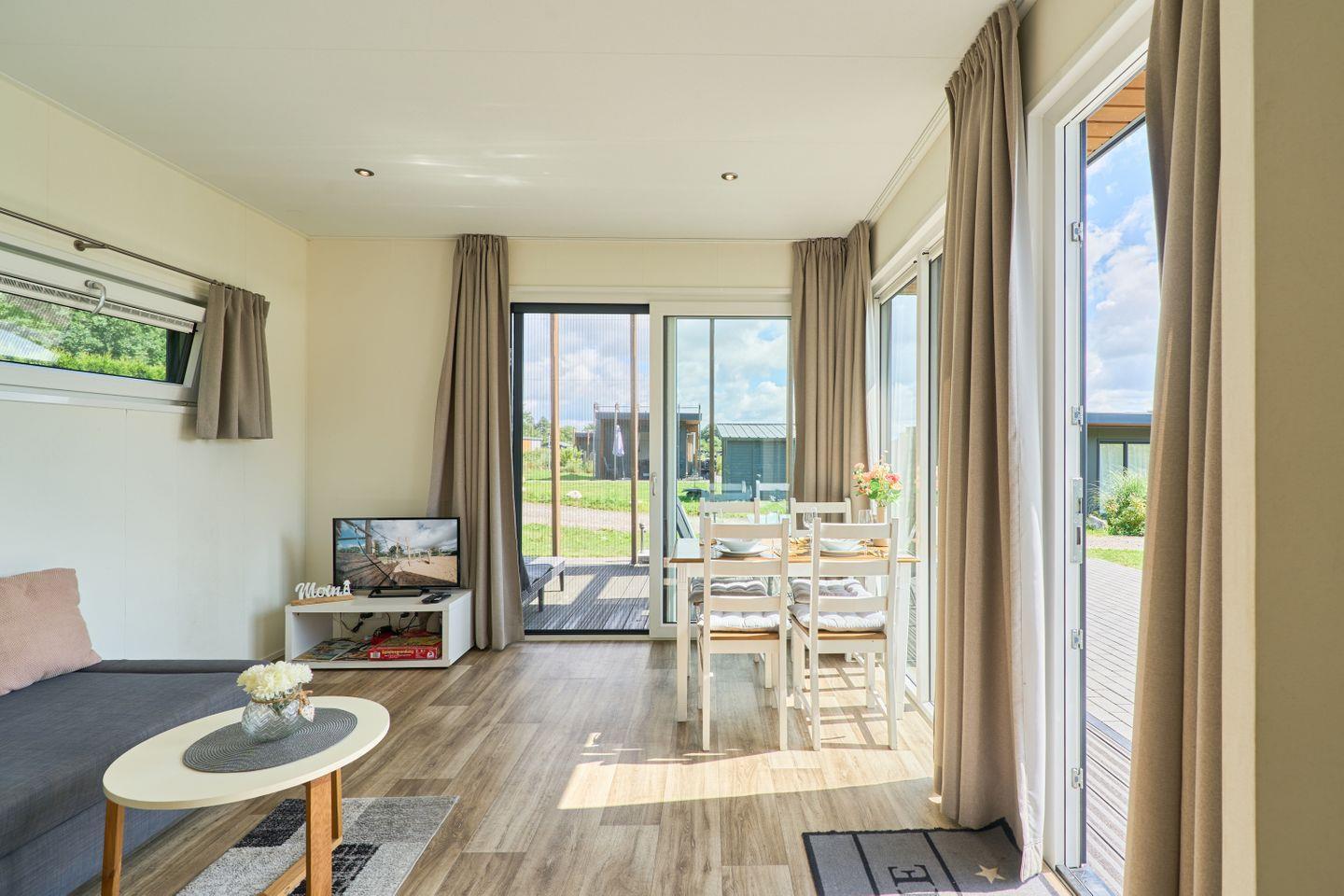 Das Wohnambiente wird durch ein gemütliches Sofa abgerundet. Für Unterhaltung sorgt ein Fernseher, Internetzugang via WLAN ist selbstverständlich vorhanden. Ein Spiegel, ein Waschbecken sowie Sichtschutz an allen Fenstern tragen zu einem angenehmen Aufenthalt bei. Das Badezimmer verfügt über eine Dusche und ein WC. Die Räumlichkeiten werden mittels Gasheizung erwärmt.