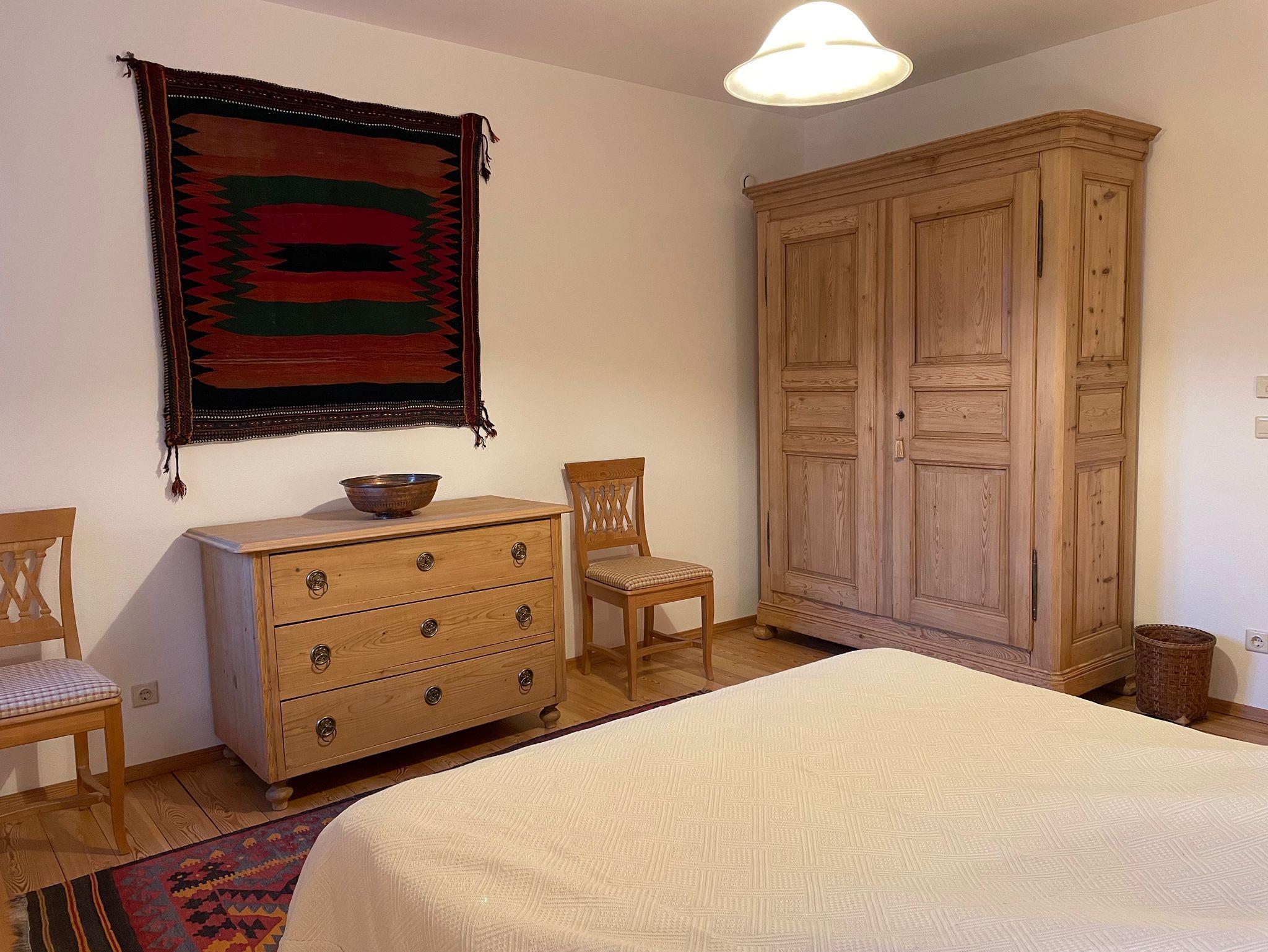 Das viele Holz (Fenster, Türen, Böden), zahlreiche Kelims an Wänden und auf Böden und ein Kachelofen vermitteln eine besonders behagliche Atmosphäre.