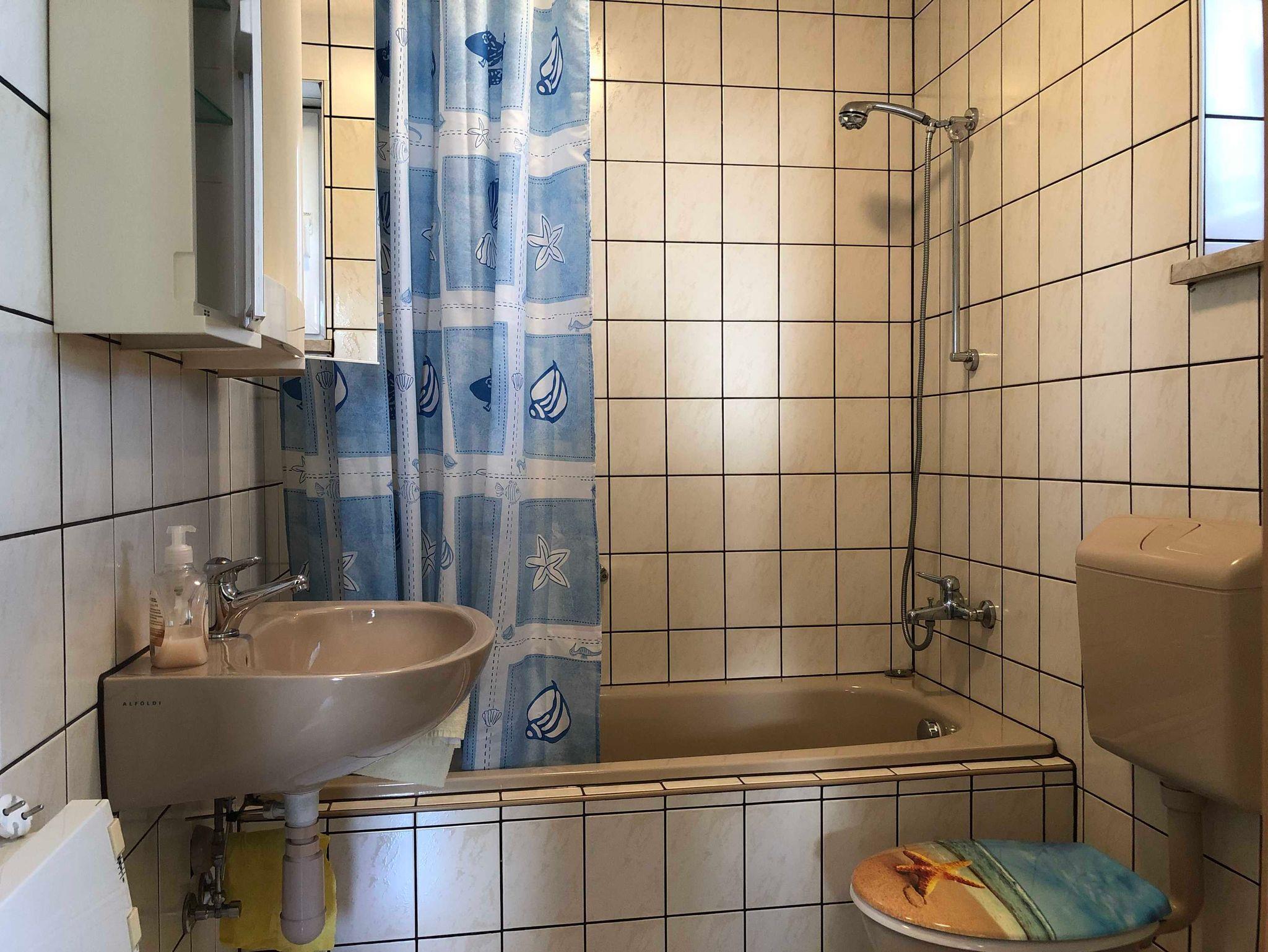 Bad mit Badewanne, Waschbecken, Spiegelschrank und WC ; Handtücher sind vorhanden.