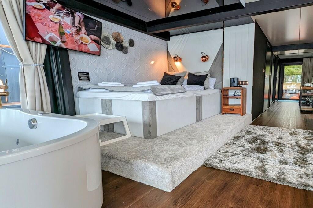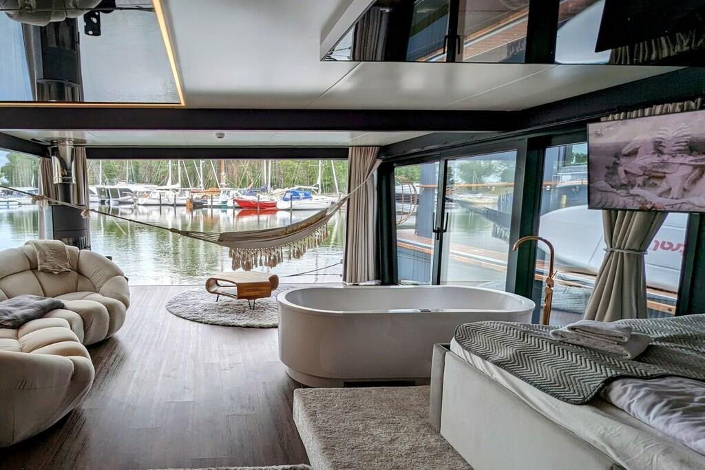 Närmare vattnet kan man inte komma för en semester. Den idylliska och ständigt växande lilla hamnen vid Jasmund Bodden – Martinshafen – är hemvist för en unik, permanent förtöjd husbåt med en svitliknande atmosfär. Från sängen kan man genom det stora panoramafönstret blicka ut över ett bubbelbadkar direkt ner i hamnen och njuta av enastående utsikt över natur och fågelliv. En massagestol och en öppen spis ger en speciell wellnessupplevelse. En liten torrbastu och två badrum med stora duschar kompletterar de lyxiga bekvämligheterna. En andra, separat hytt erbjuder ytterligare en tillflyktsort. Ett kylskåp, handfat, kaffebryggare och brödrost möjliggör självhushåll. Frukost kan beställas i hamnens bistro. Precis runt hörnet inbjuder stranden till att njuta av vattensporter eller bara koppla av och titta på vågorna.