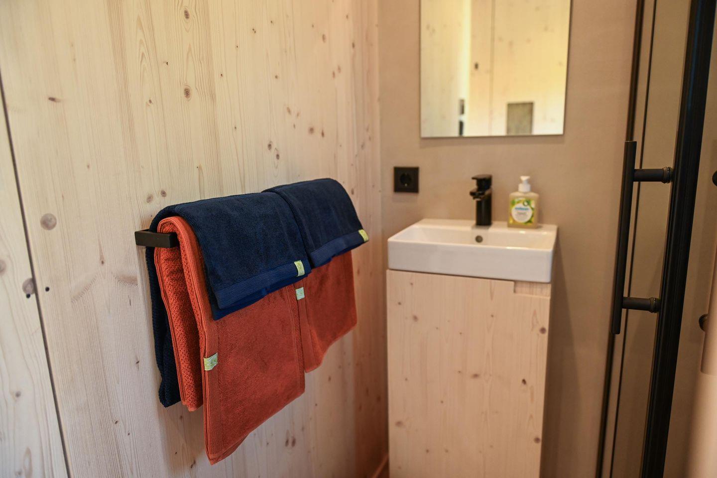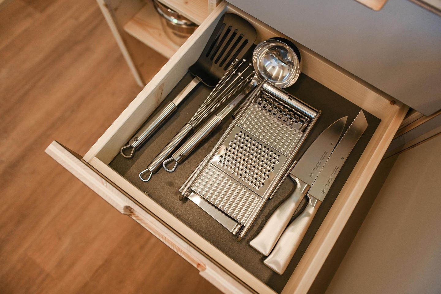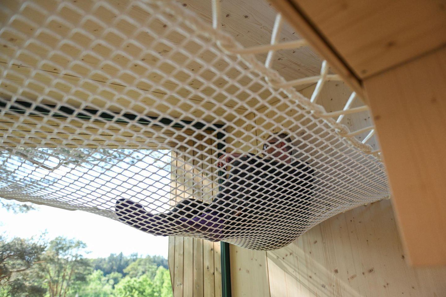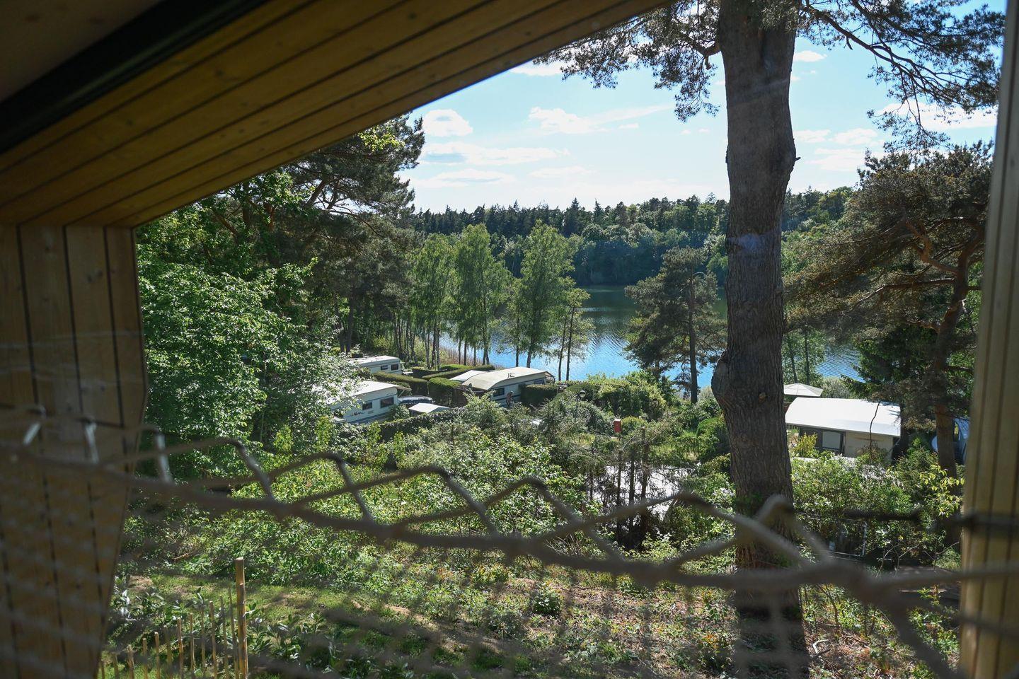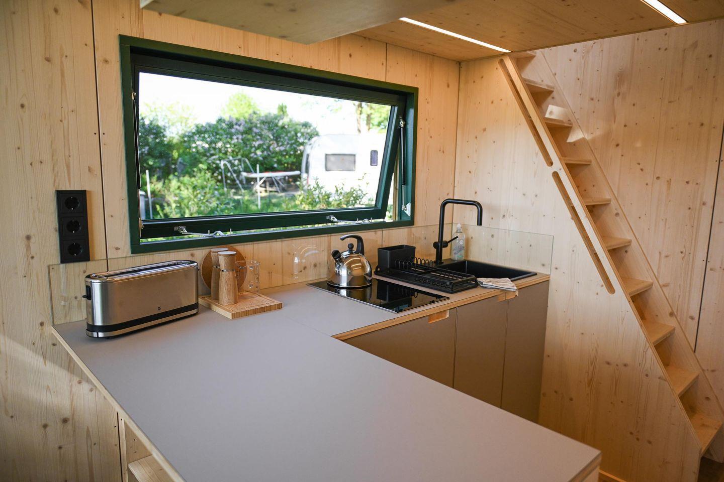 Direkt daneben liegt die kompakte, gut ausgestattete Küche in L-Form mit zwei Induktionsfeldern, einem klappbaren Fenster zur Terrasse und einem kleinen Tresen für entspannte Kochsessions. French Press, Toaster, Flötenkessel, Geschirr, Besteck, Töpfe, Pfanne und viele kleine Details wie Salz, Pfeffer, Spülmittel oder Schneidebrett machen das Kochen unkompliziert und angenehm. Über eine kleine Treppe erreichst du die Schlafebene mit einem 1,40?m breiten Bett, Dachfenster, Verdunklungsmöglichkeiten und einem Ausblick, der auch hier den See in Szene setzt. Das absolute Highlight: Vom Bett aus gelangst du direkt auf ein luftiges Relax-Netz, das über dem Wohnbereich schwebt – ein besonderes Erlebnis für bis zu zwei Personen.
