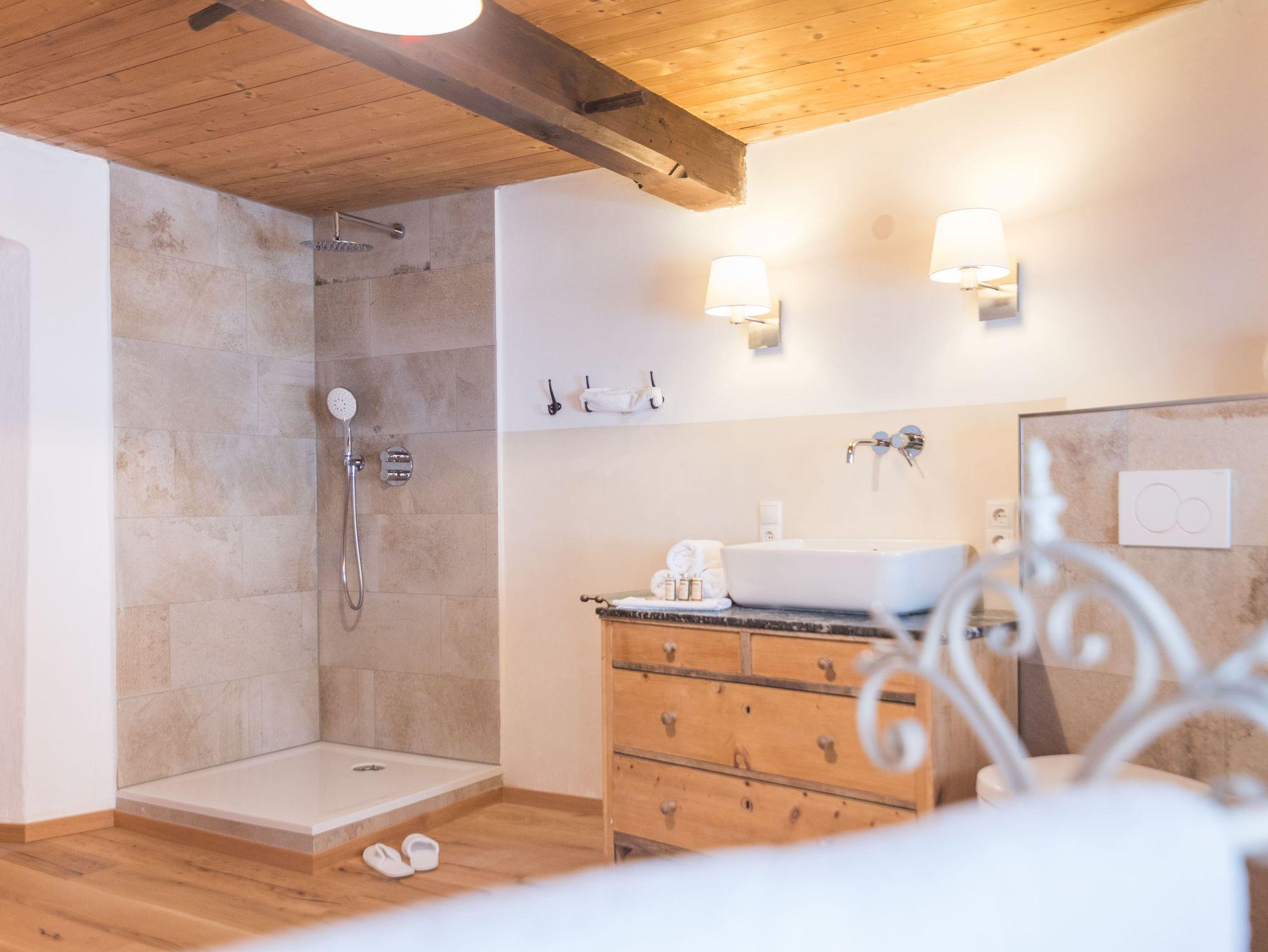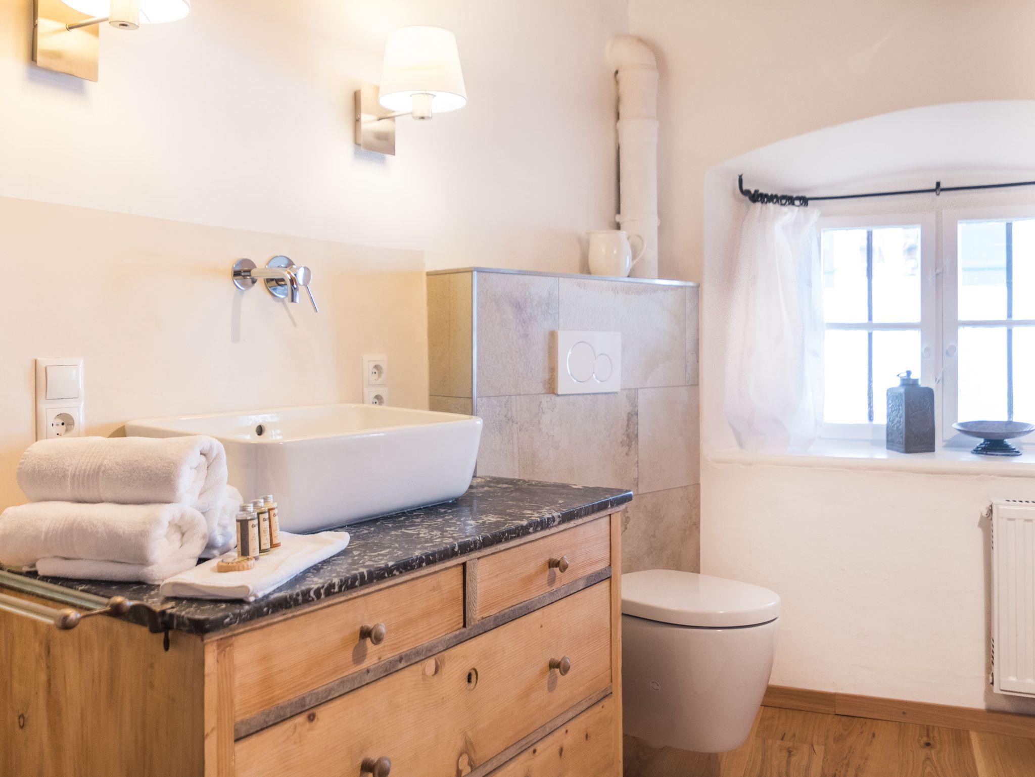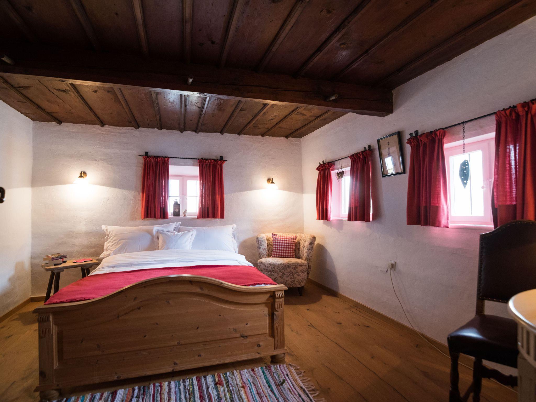 Apartment MAX (bis 6 Personen) befindet sich im ersten Obergeschoss im vorderen Teil des Schusterhäusls. Es verfügt über einen großen Balkon, insgesamt drei Schlafzimmer mit King-Size Betten und ein luxuriöses Bad in Naturstein mit Naturholzboden inkl. Föhn, Glasdusche und Handtüchern. Es erwartet Sie zudem eine neue, vollausgestattete Küche mit einer kleineren, sehr gemütlichen Sitzgelegenheit. Ein großer Esstisch mir original „Kanapee“ aus alten Zeiten und SMART-TV befinden sich im großen Wohnzimmer mit Aussicht auf den Dorfplatz.