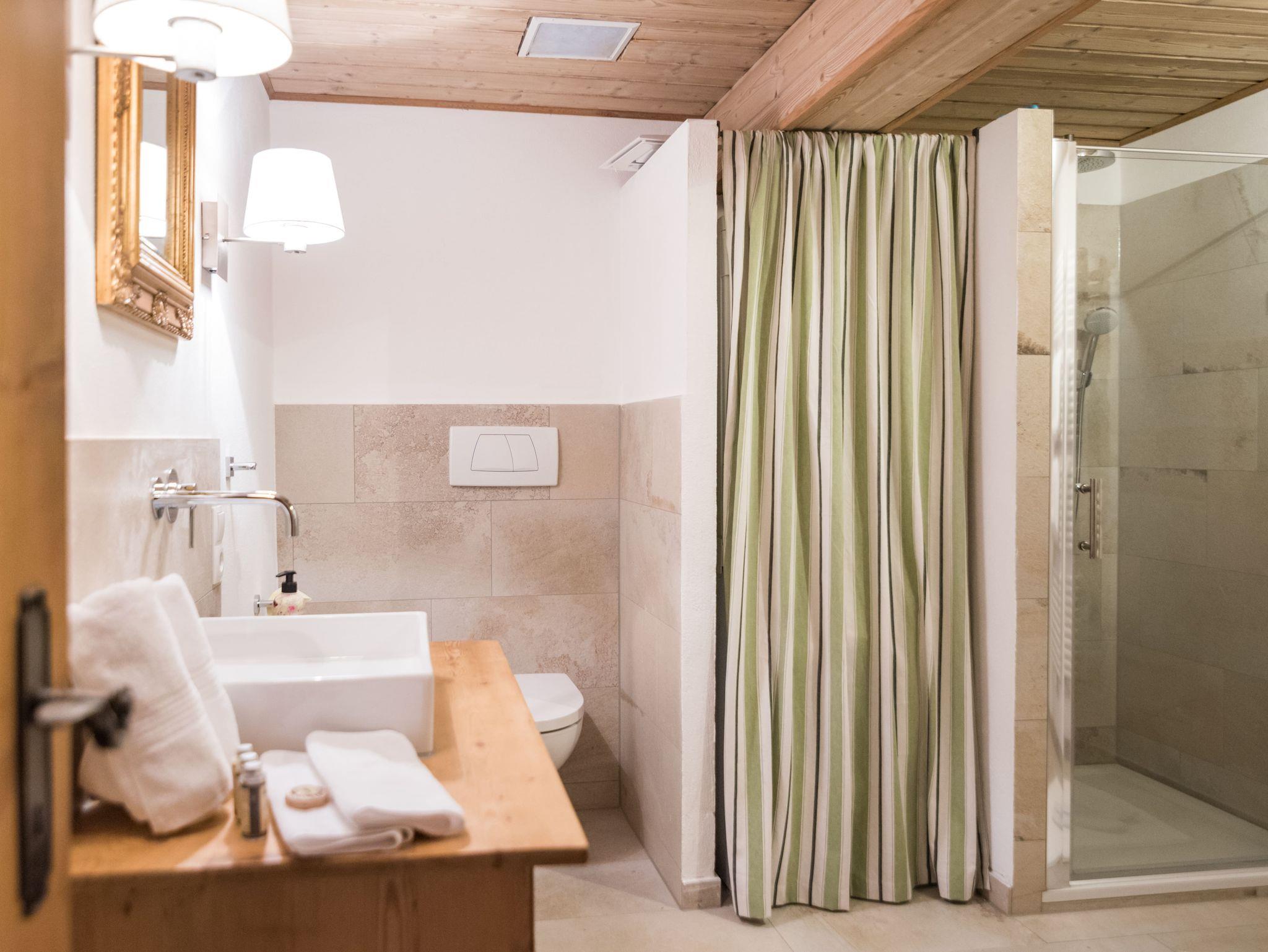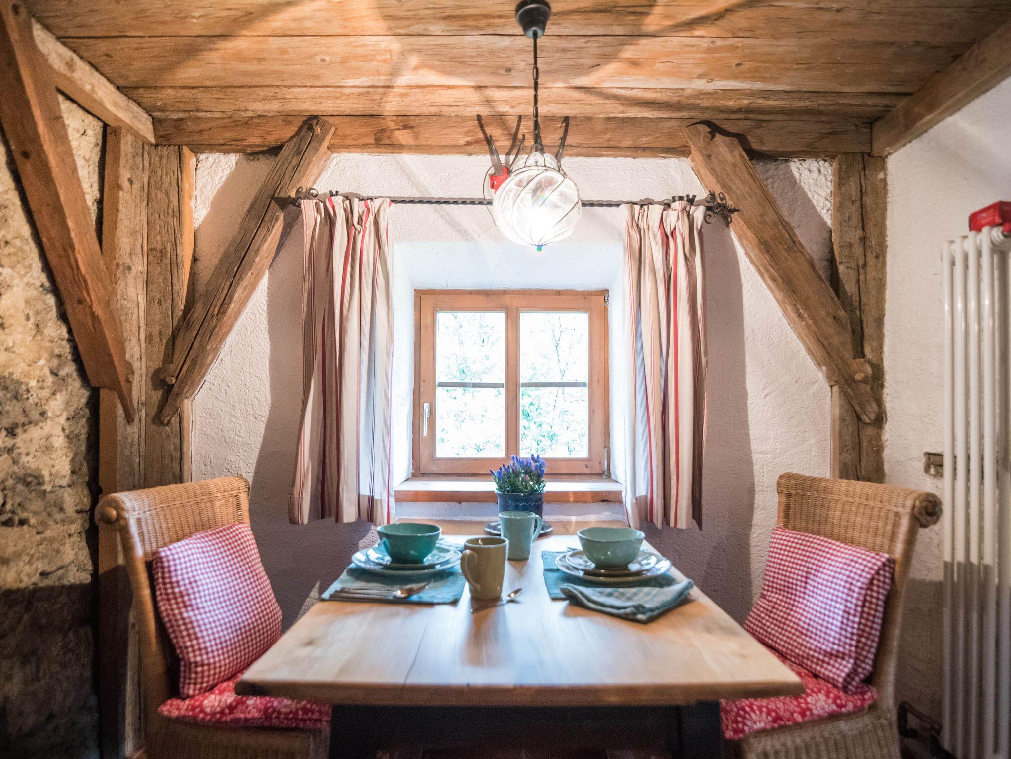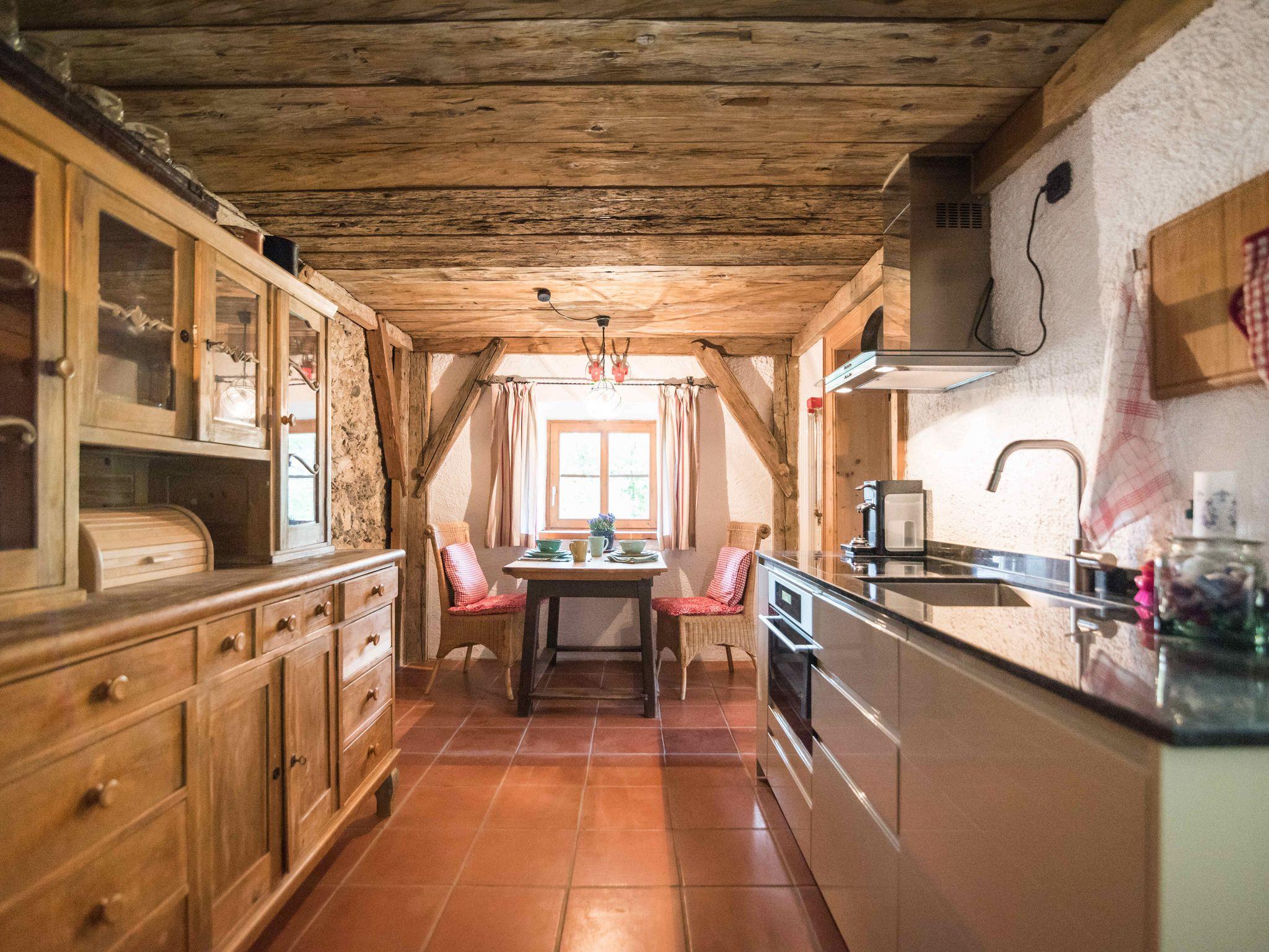 befindet sich im ersten Obergeschoss der hinteren Hälfte des Schusterhäusls. Es verfügt über einen Balkon mit Blick zum Garten, ein Schlafzimmer mit King-Size Bett. Ein luxuriöses Bad in Naturstein inkl. Föhn, Glasdusche und Handtüchern. Darüber hinaus stehen Ihnen eine neue, vollausgestattete Küche mit Altholzdecke inklusive Anrichte und Esstisch zur Verfügung. Das sehr geräumige Wohnzimmer ist teilweise holzvertäfelt. Ein Kachelofen, SMART-TV und einer großen Eckcouch sind hier einige Highlights. Auf Wunsch können wir Ihnen hier noch ein komfortables Bett 180 x 180 cm für 2 weitere Gäste anbieten.