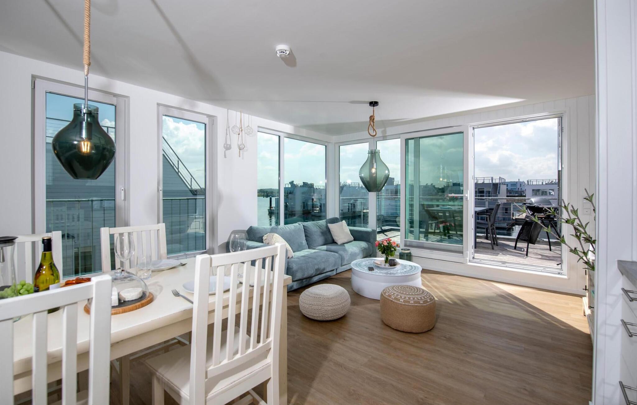 Vatten så långt ögat kan nå. Det hisnande landskapet kan avnjutas genom panoramafönster från golv till tak och takterrassen erbjuder en spektakulär 360-graders utsikt över Schlei, Östersjön och marinan. Östersjön ligger bara en badstege bort och sandstranden i Baltic Sea Resort ligger inom gångavstånd. Under årets mörkare månader ger golvvärme och en bastu mysig komfort, eftersom hälsoprogrammet ombord är ett måste. Förutom hamnbion står Smart TV:n med hemunderhållningsprogram för underhållningen.