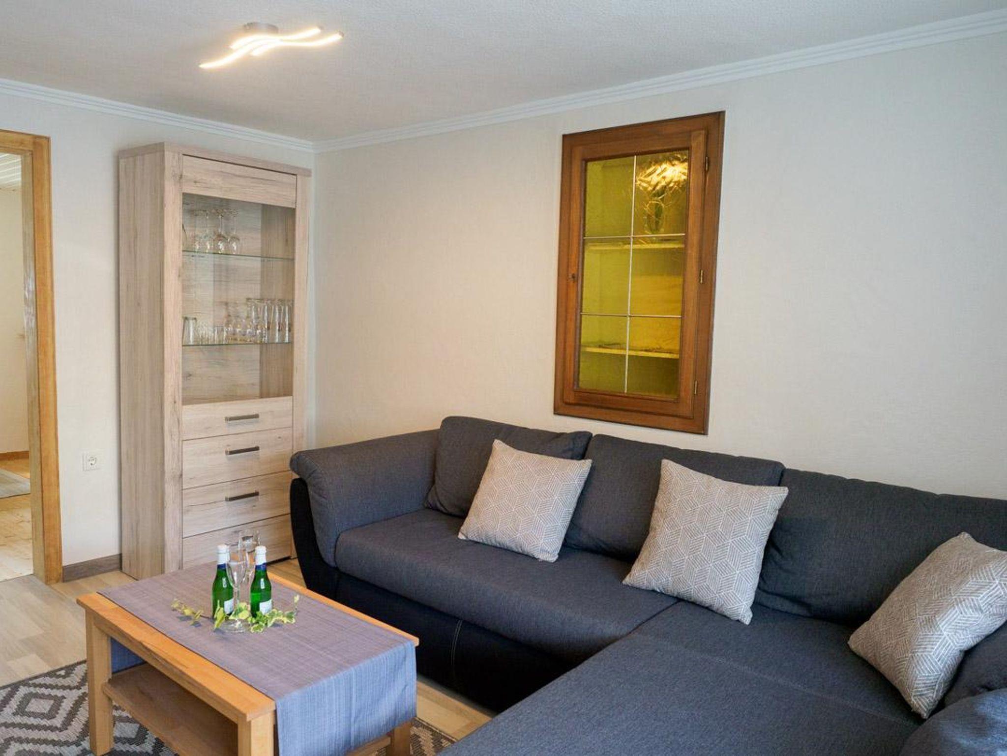 Im Wohnzimmer befindet sich ein Ecksofa, ein Couchtisch, eine Vitrine, ein Sideboard mit Fernseher, ein Pelletofen und ein Informationsschrank.