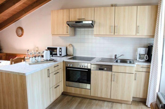 Wohnzimmer mit neuer großer Küchenzeile mit Spülmaschine, 4-Platten-Ceranfeld und Backrohr, gemütlicher Essecke, Wohnbereich mit neuer komfortabler Ausziehcouch, sep. Schlafzimmer mit neuen Bandscheibenmatratzen, neue