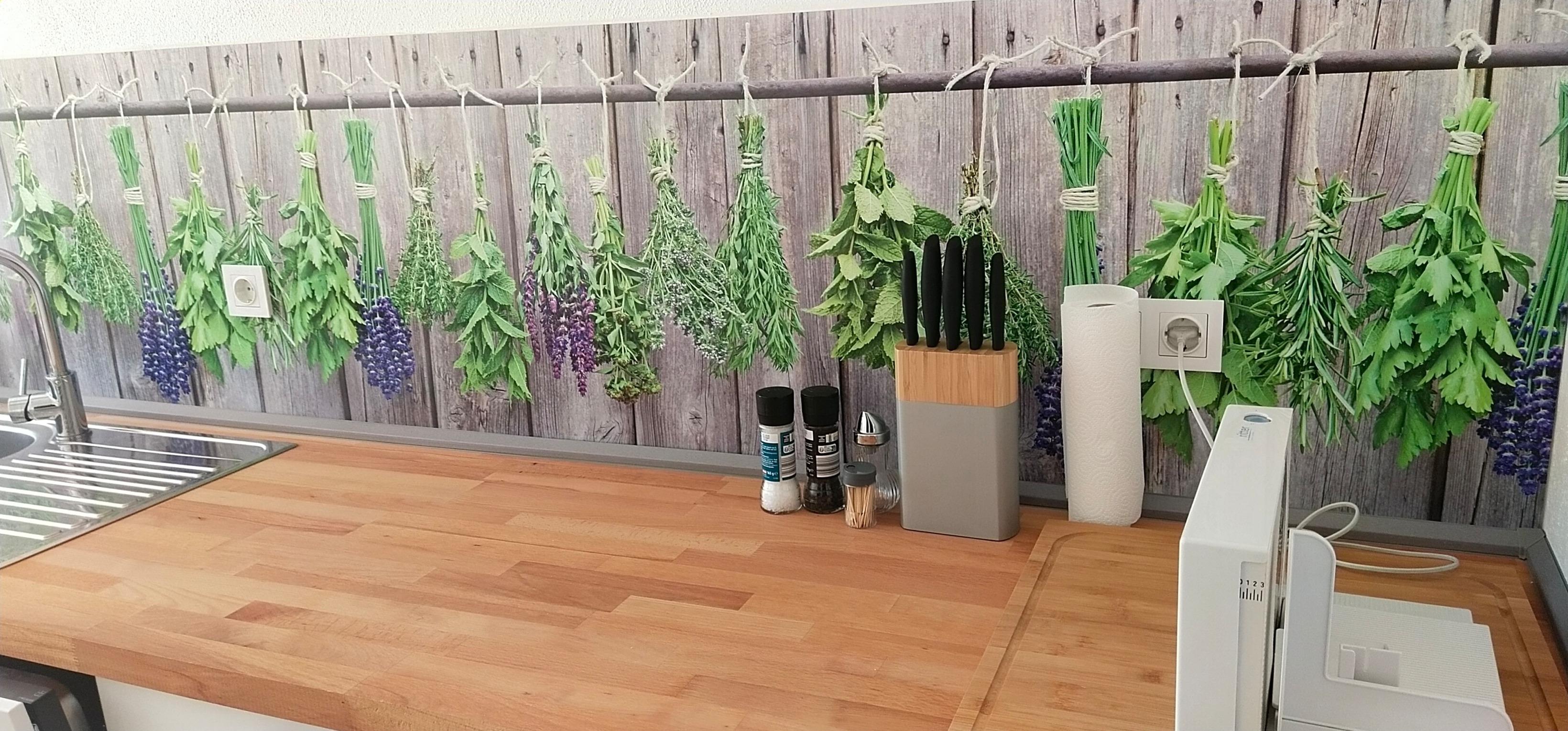 In der Küche ist ein portables Steckdosenradio und ein portables zweier Induktionskochfeld. Der Backofen ist erhöht eingebaut und natürlich ist auch ein Geschirrspüler und eine Mikrowelle vorhanden. Brotschneidemaschine, Mixer, Küchenwaage, Kaffeemaschine und Toaster sind natürlich Bestandteile der Küche. Die Sitzecke lädt zu den Mahlzeiten ein oder auch nur zum Relaxen.