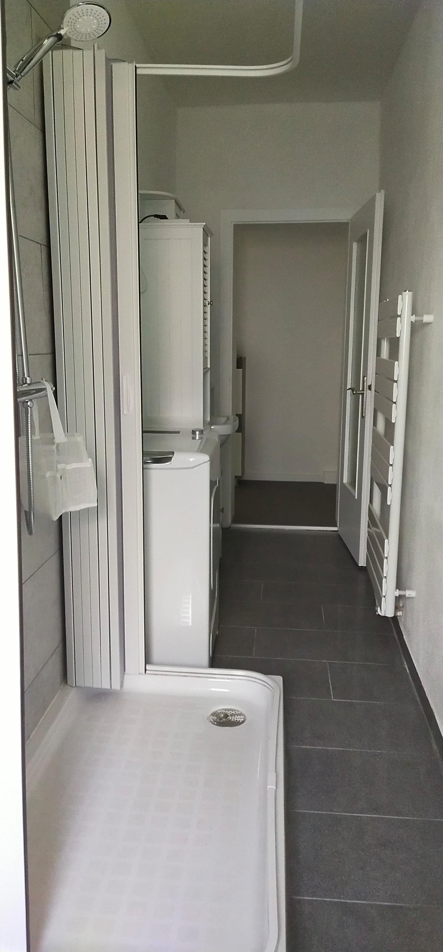 Das Badezimmer ist mit einer 70x120 Dusche und einem erhöhtem, randlosen WC ausgestattet. Eine Waschmaschine ist auch im Badezimmer vorhanden.