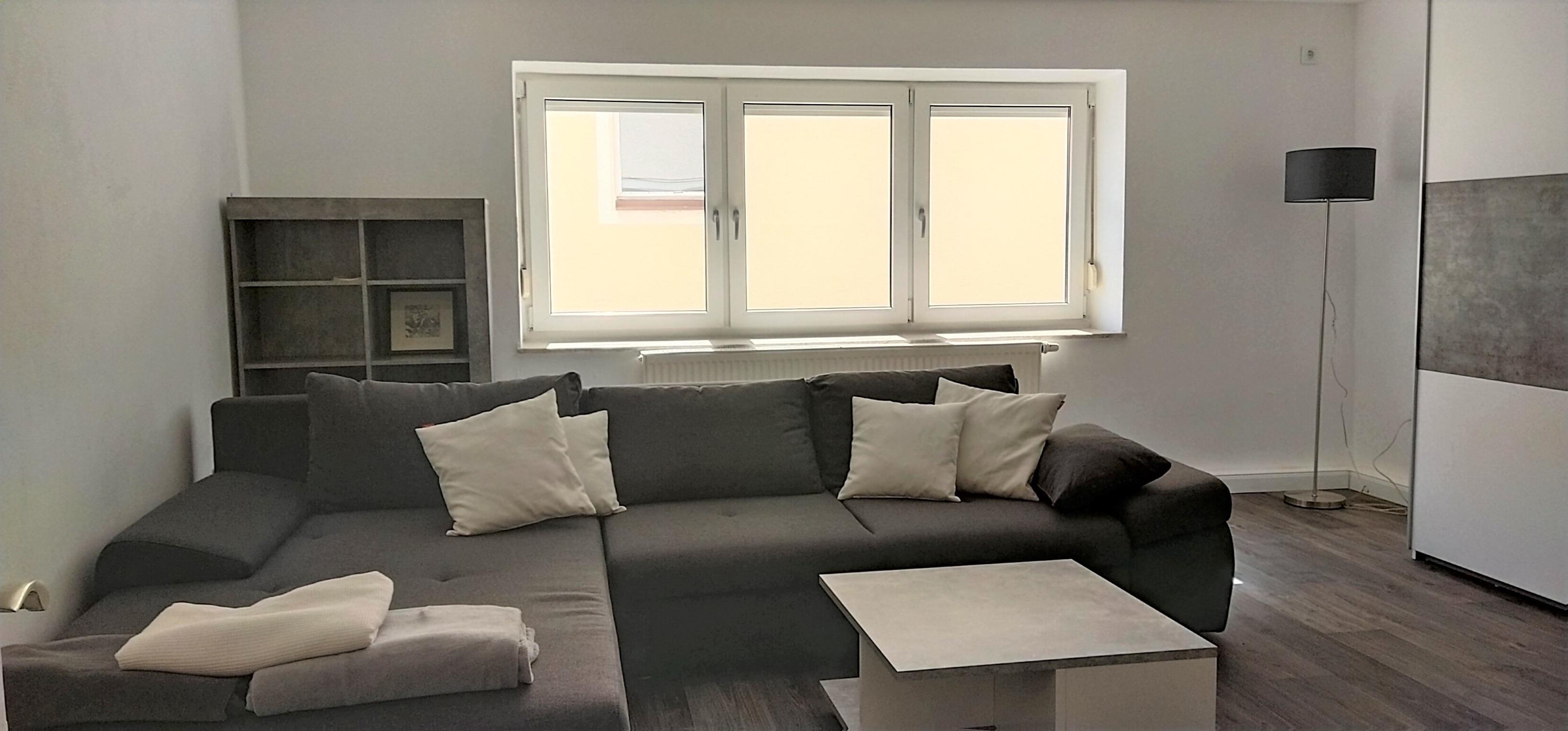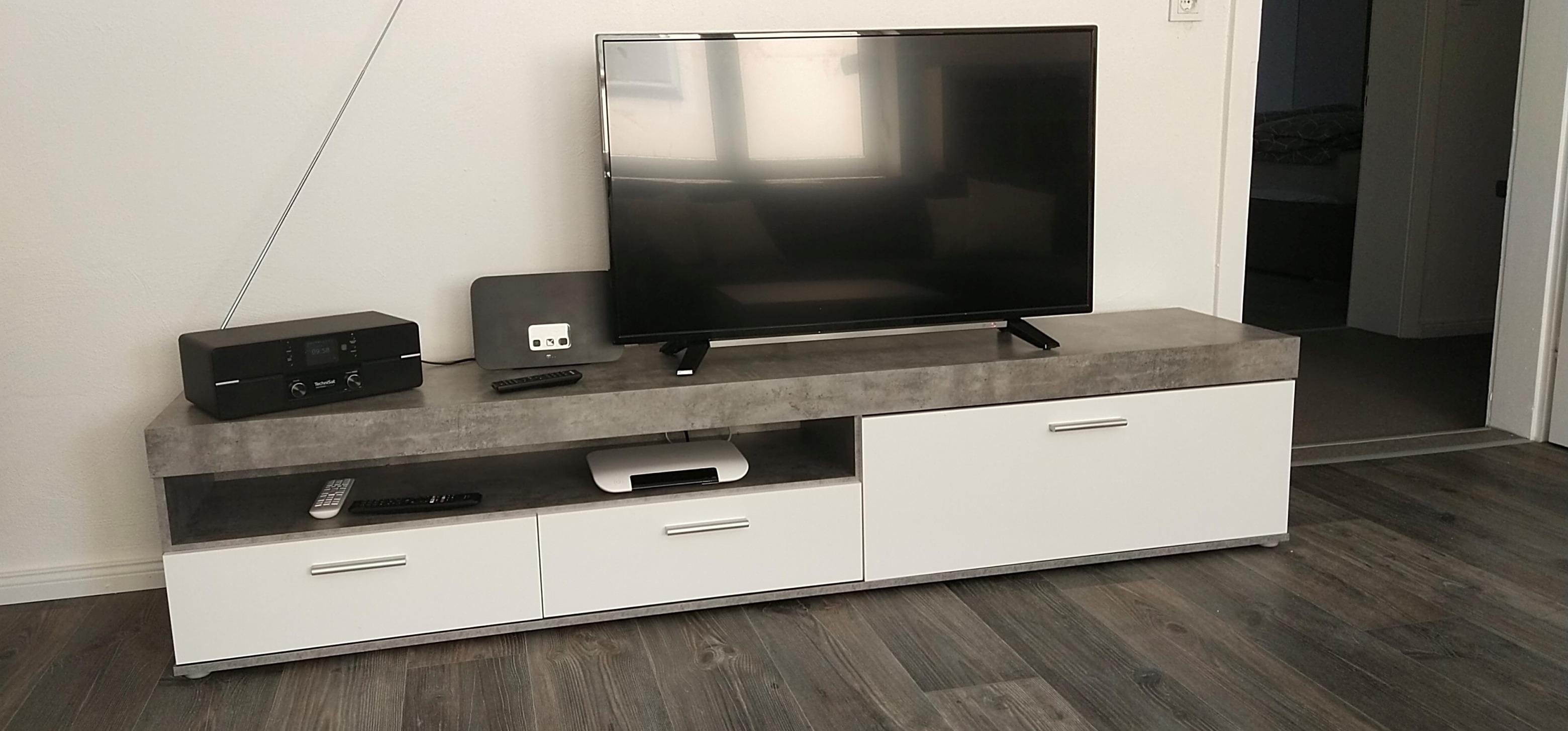 Das Wohnzimmer ist mit einer großen Schlafcouch, Smart TV mit Magenta TV und DAB Radio ausgestattet.