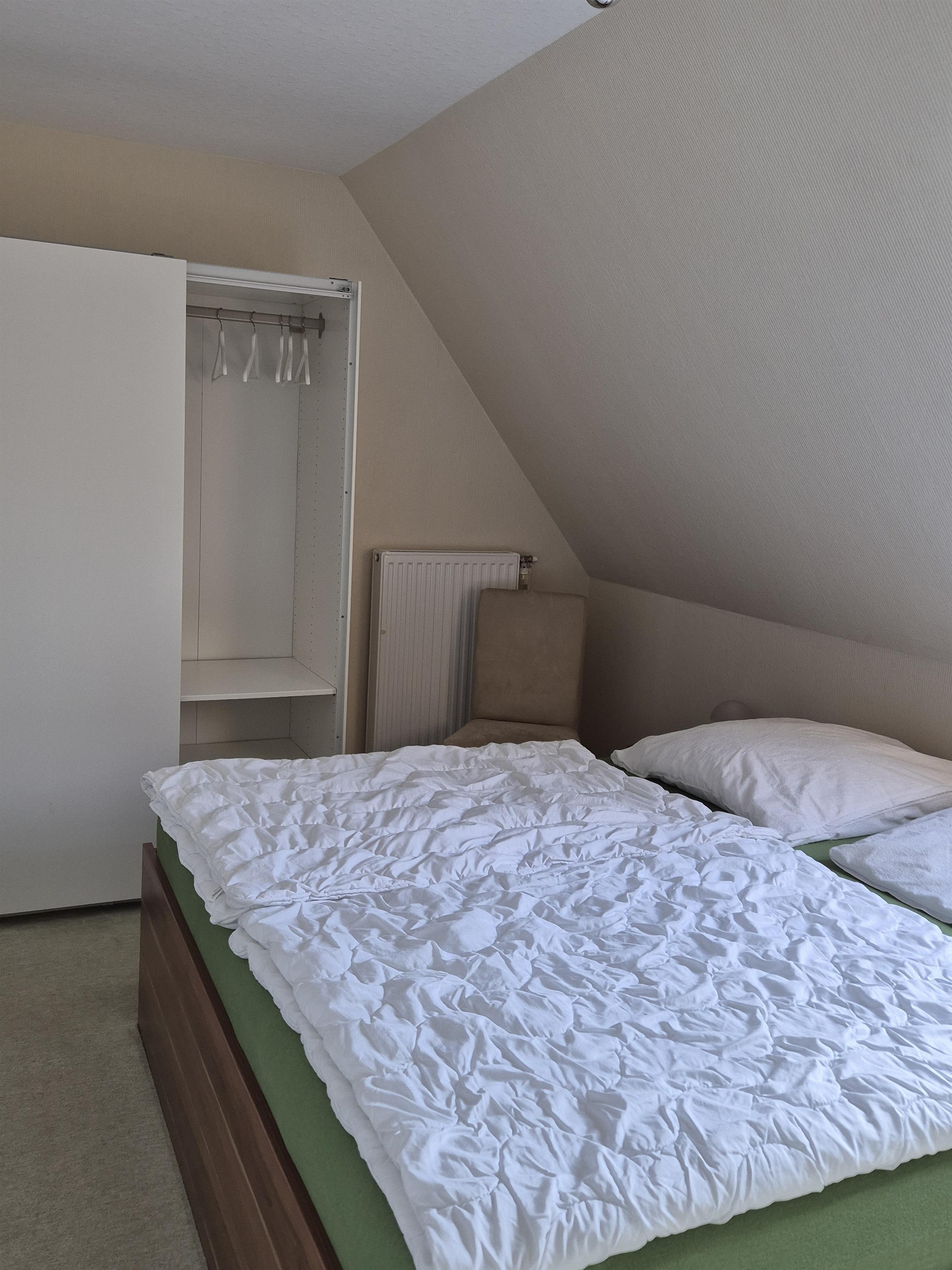 Im Erdgeschoss ist der Wohn-/ Essbereich mit einem Flachbild TV und dem Ausgang zur Terrasse. Eine gut ausgestattete separate Küche, sowie ein Duschbad mit WC. Im Obergeschoss befinden sich ein Wannenbad mit WC und zwei Schlafräume. Der große Schlafraum hat ein Doppelbett(180x200cm) und einen Flachbild TV, der kleine Schlafraum ein Einzelbett (100x200cm).