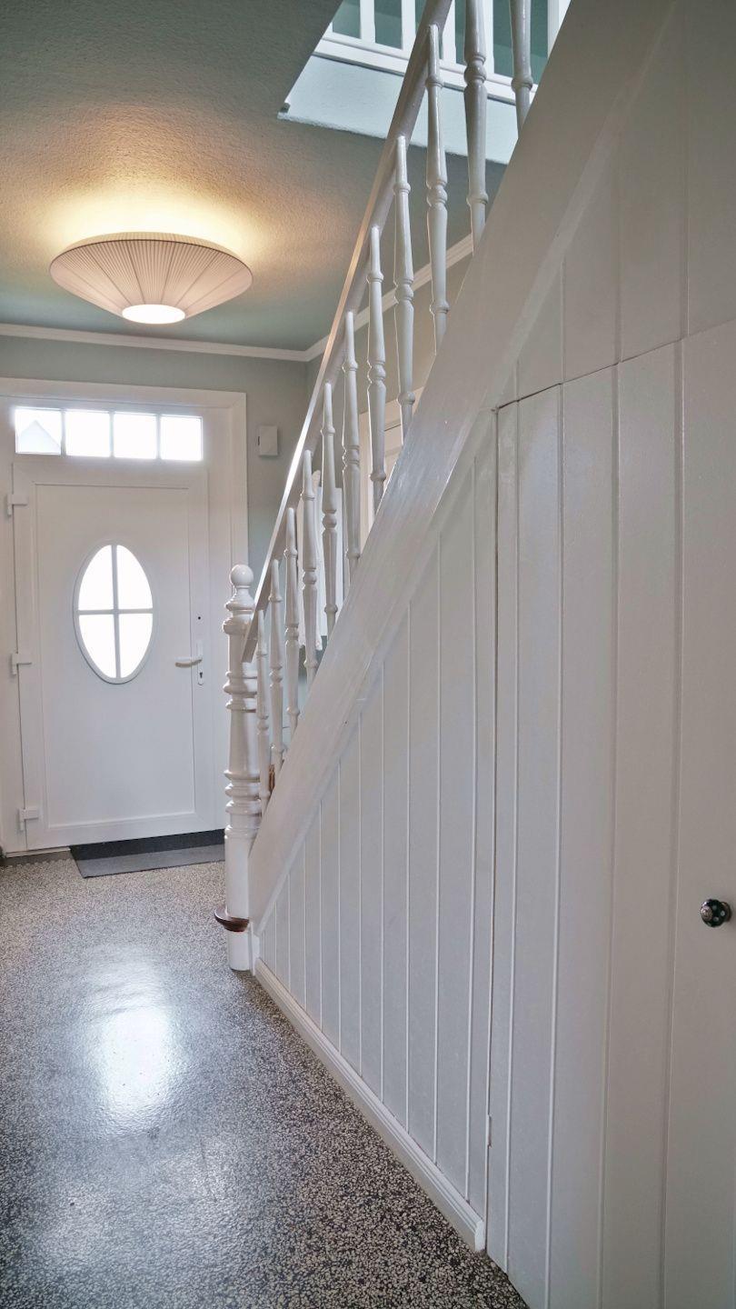Von der Küche geradeaus kommen Sie in den zentralen Hausflur mit Haustür und linker Hand das Schlafzimmer, rechts die Treppe in das Obergeschoss sowie die Tür zum Ess- und Wohnzimmer.