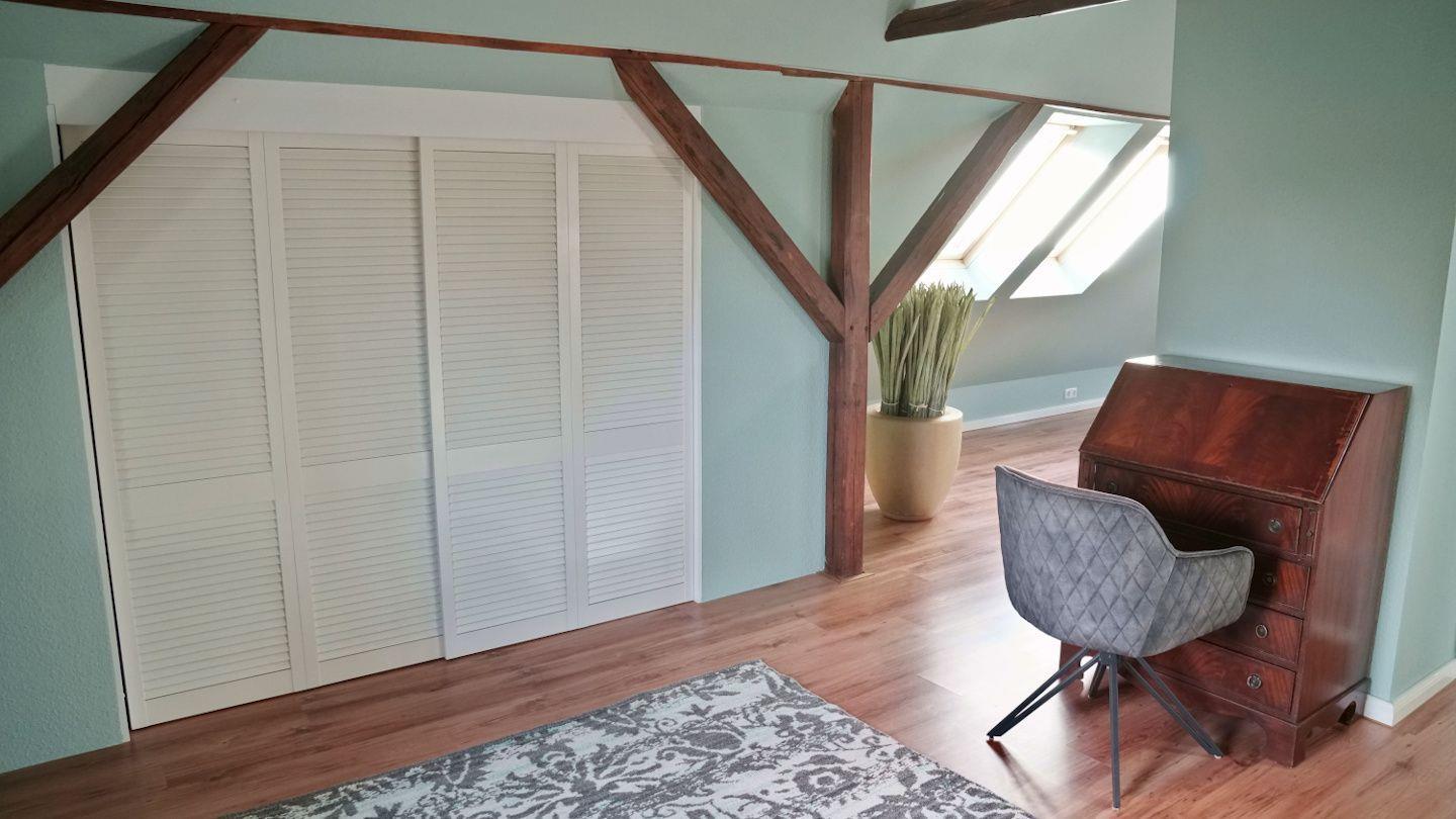 Im Obergeschoss erwartet Sie ein Bett aus Tausend und einer Nacht zum Träumen und Ausruhen vom Stress des Alltags. Außerhalb des Blickbereiches hinter einem Mauervorsprung finden Sie einen kleinen Arbeitsplatz (nur für Notfälle). Hier können auch die schönsten Briefe geschrieben werden