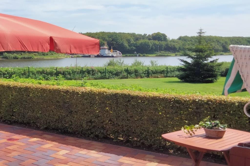 En fantastisk utsikt direkt över, nästan "inuti", Kielkanalen i 25725 Schafstedt. Du och två personer bor på bottenvåningen, allra längst fram. Lägenheten ligger i en återvändsgränd med egen ingång och carport. Lägenheten har ett separat rum som kan användas som tillflyktsort. På den stora terrassen kan du sitta i en strandstol och beundra den ena båten efter den andra.