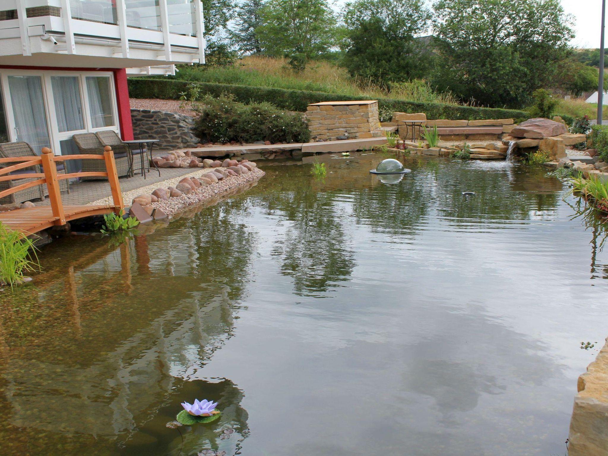 Ein wundervoller und aufwendig angelegter Zierteich mit Kois und anderen Fischen, 2 Wasserfällen und einem Bachlauf gehört zur Anlage.