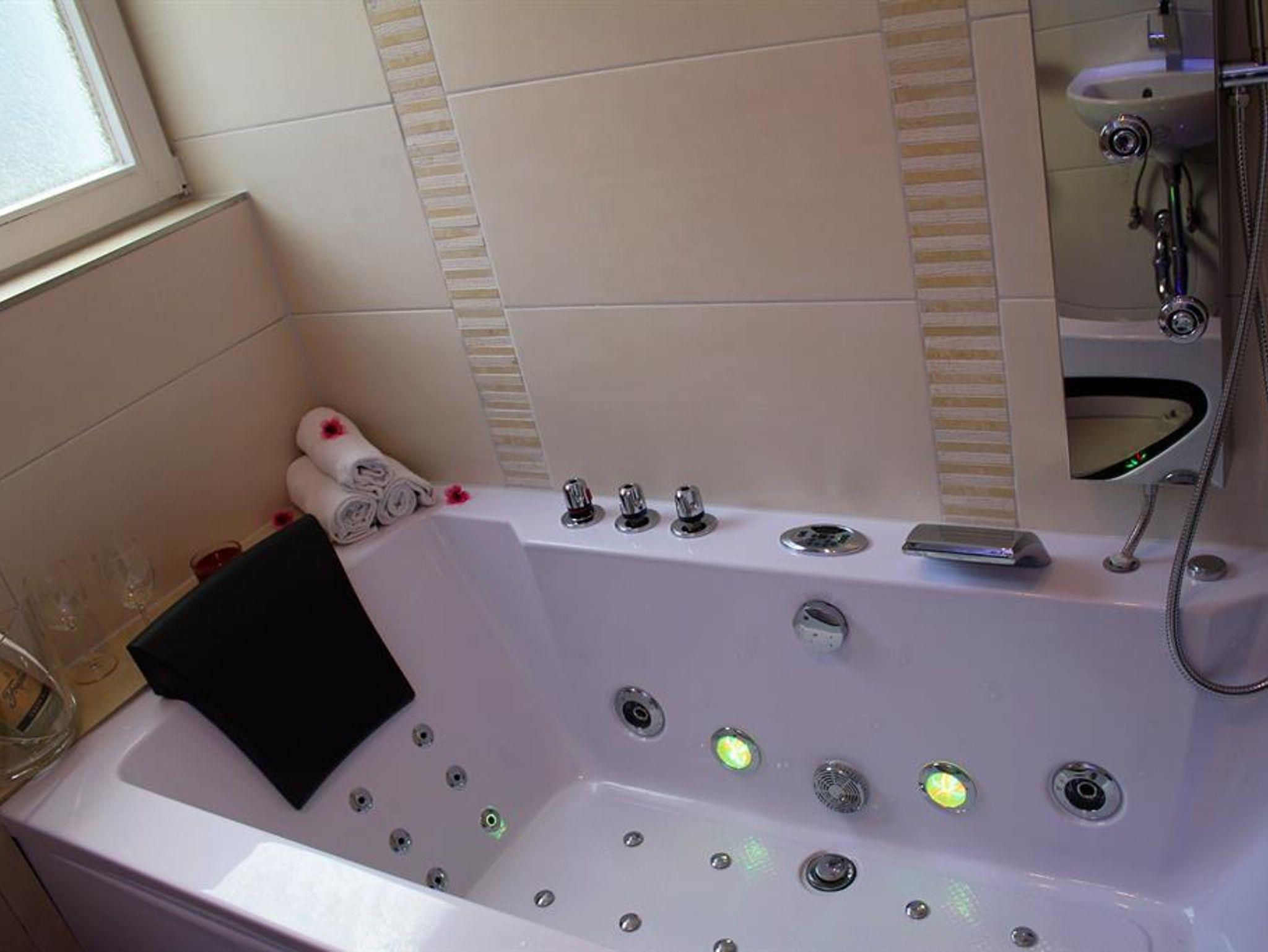 Im hellen Bad finden Sie einen 2 Personen-Whirlpool. Verwöhnen Sie sich selbst im Whirlpool mit einer Lichttherapie, der Whirlpoolfunktion und vielen weiteren Funktionen. Auch ein Radio ist integriert.