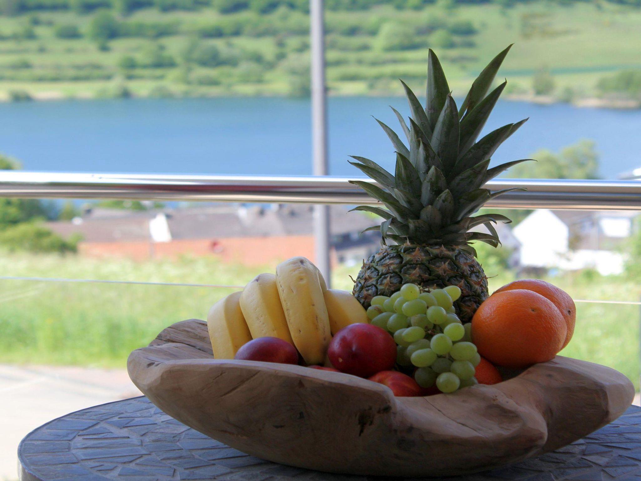 Die Ferienwohnung Maarpanorama liegt im Mittelgeschoß (Ebenerdig zum Haupteingang) und bietet einen atemberaubenden Blick auf den See, die herrliche Landschaft und den gepflegten Zierteich.