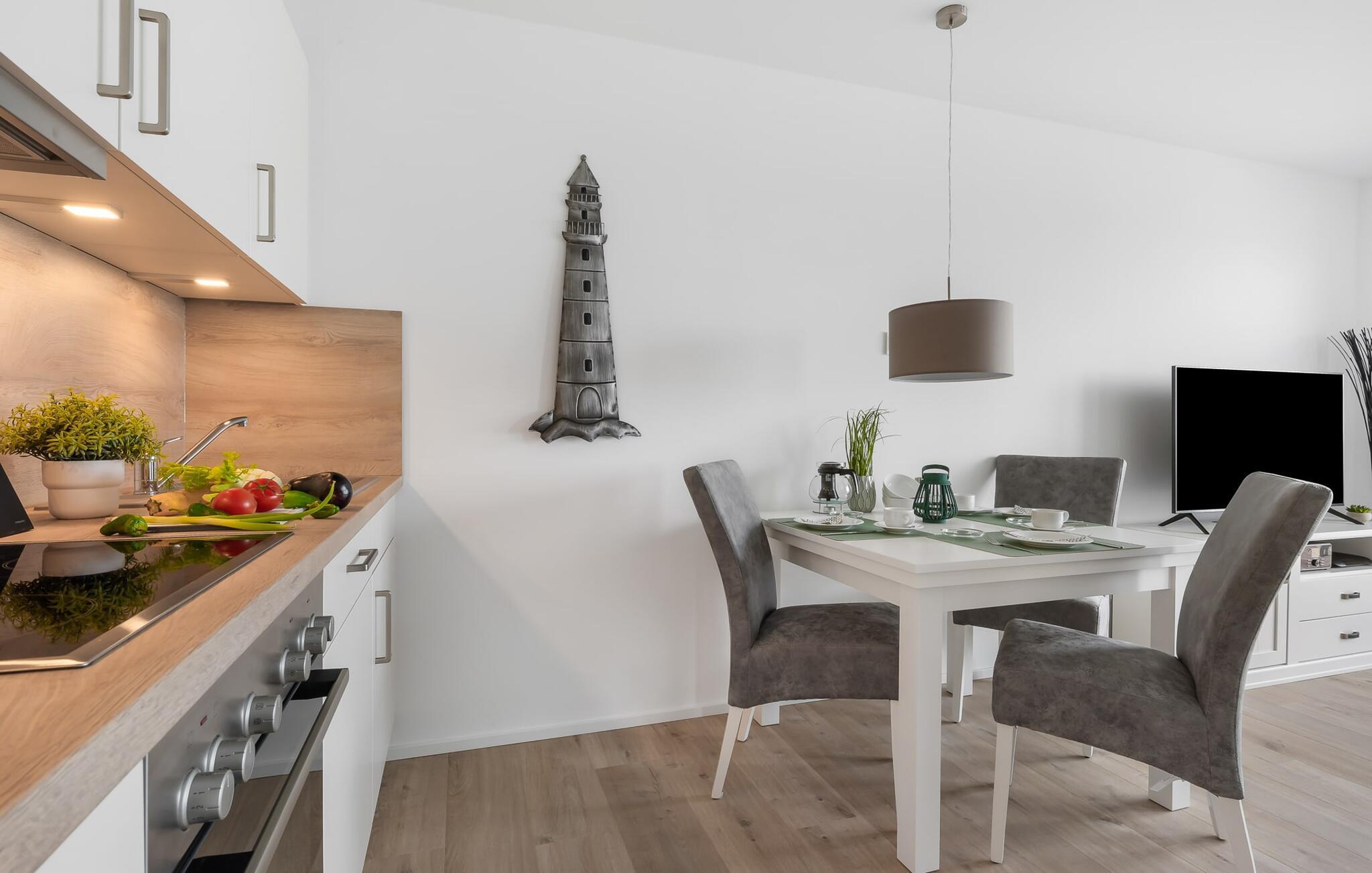 Avkopplande semesterlyx i en modern semesterlägenhet för 3 personer nära vattnet. Semesterlägenheten är inredd med hög standard och stilfullt möblerad och har ett exklusivt läge direkt vid hamnpromenaden i OstseeResort Olpenitz. SCHLEIBLICK-utsikten från en av de ljusa fönsterfronterna faller på de flytande husen, Östersjöfjorden Schlei med passerande segelfartyg och fyren i Schleimünde. Precis som de vackra solnedgångarna som kan beskådas från balkongen är även hamnbion en garanterad upplevelse.