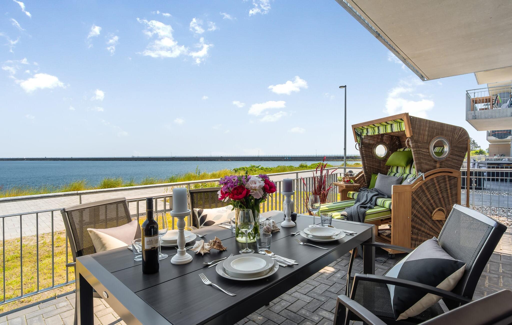 Det rymliga vardagsrummet/matsalen med öppen planlösning välkomnar dig med moderna möbler av hög kvalitet och stor uppmärksamhet på detaljer. Oavsett vilket håll du vänder dig åt kan du inte undgå utsikten över Östersjön, Schlei och marinan vid Ostseeresort Olpenitz. En oändlig vidsträckt yta i blå nyanser sträcker sig ut framför dig och är nästan otrolig. Och när du kliver ut på den angränsande terrassen inser du Östersjöns elementära kraft.