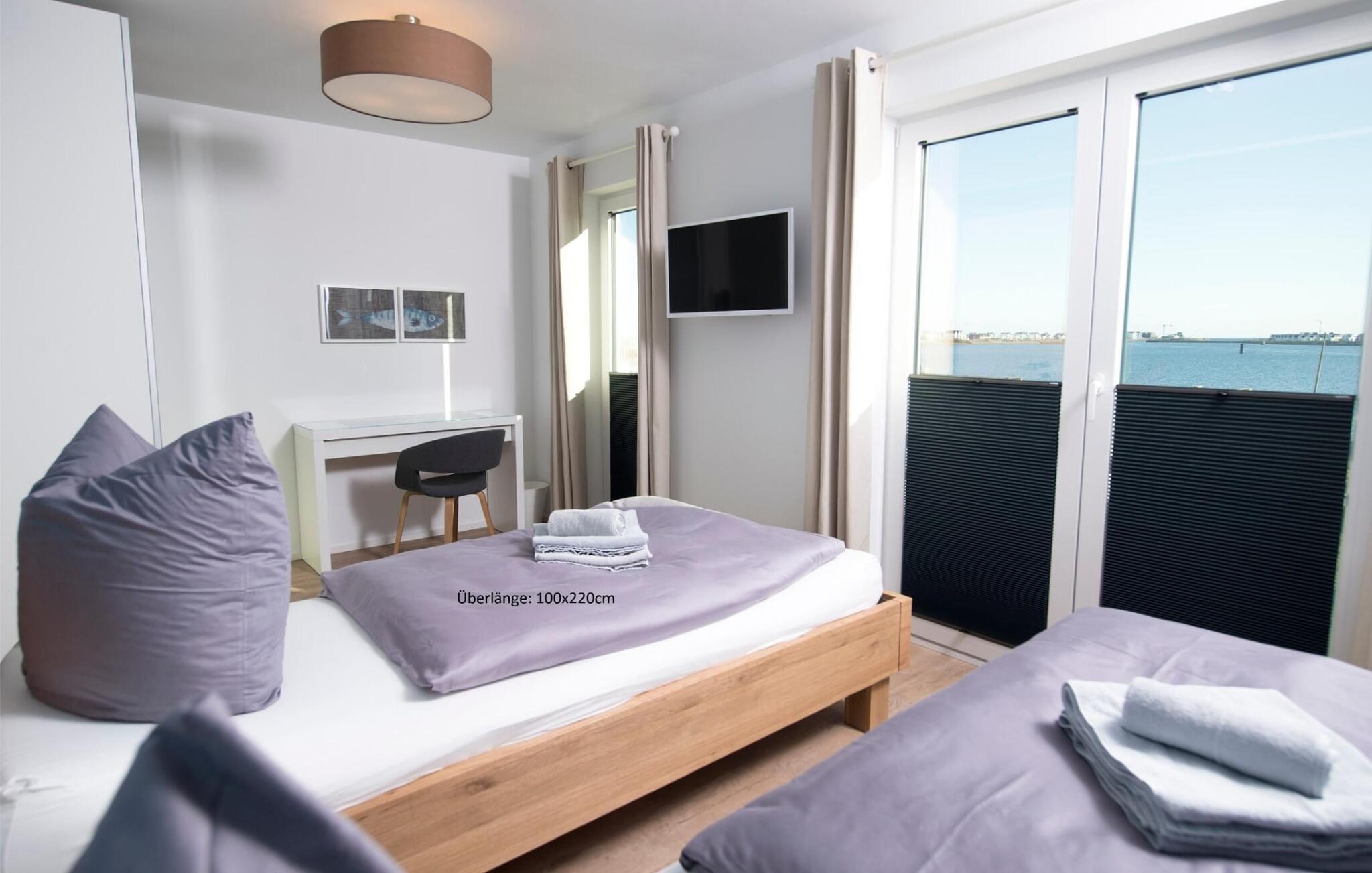 Det andra sovrummet har utsikt över marinan och har två extra långa enkelsängar som kan skjutas ihop på ett flexibelt sätt. Sovrummet är utrustat med en platt-TV och ett skrivbord. Färgschemat förmedlar en harmonisk känsla av rymd.