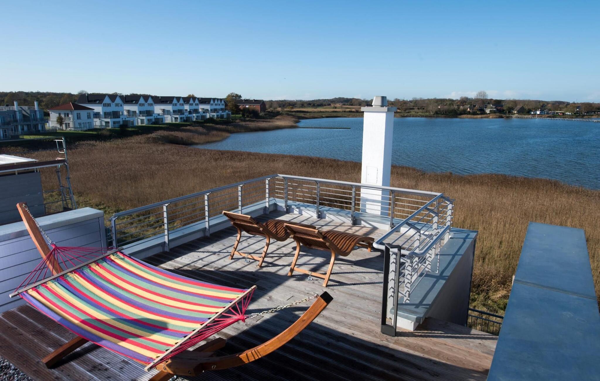 Höjdpunkten på semesterbostaden Schleiufer 54 är takterrassen med 360 graders utsikt över vattnet. Njut av att sola i en hängmatta ovanför vattnet med utsikt över segelfartyg som passerar på Schlei och hamnbiografen i marinan.