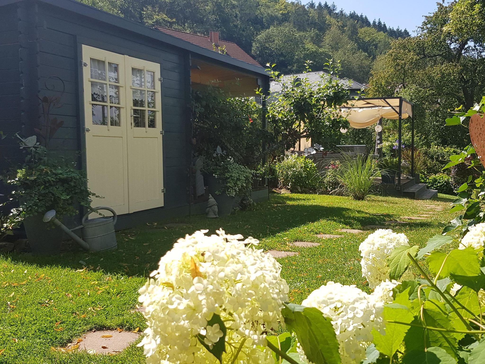 Im dazugehörigen Garten mit zauberhaftem Fernblick wartet ein Gartenhaus mit überdachter Außenlounge und einer Sonnenterasse auf unsere Gäste.