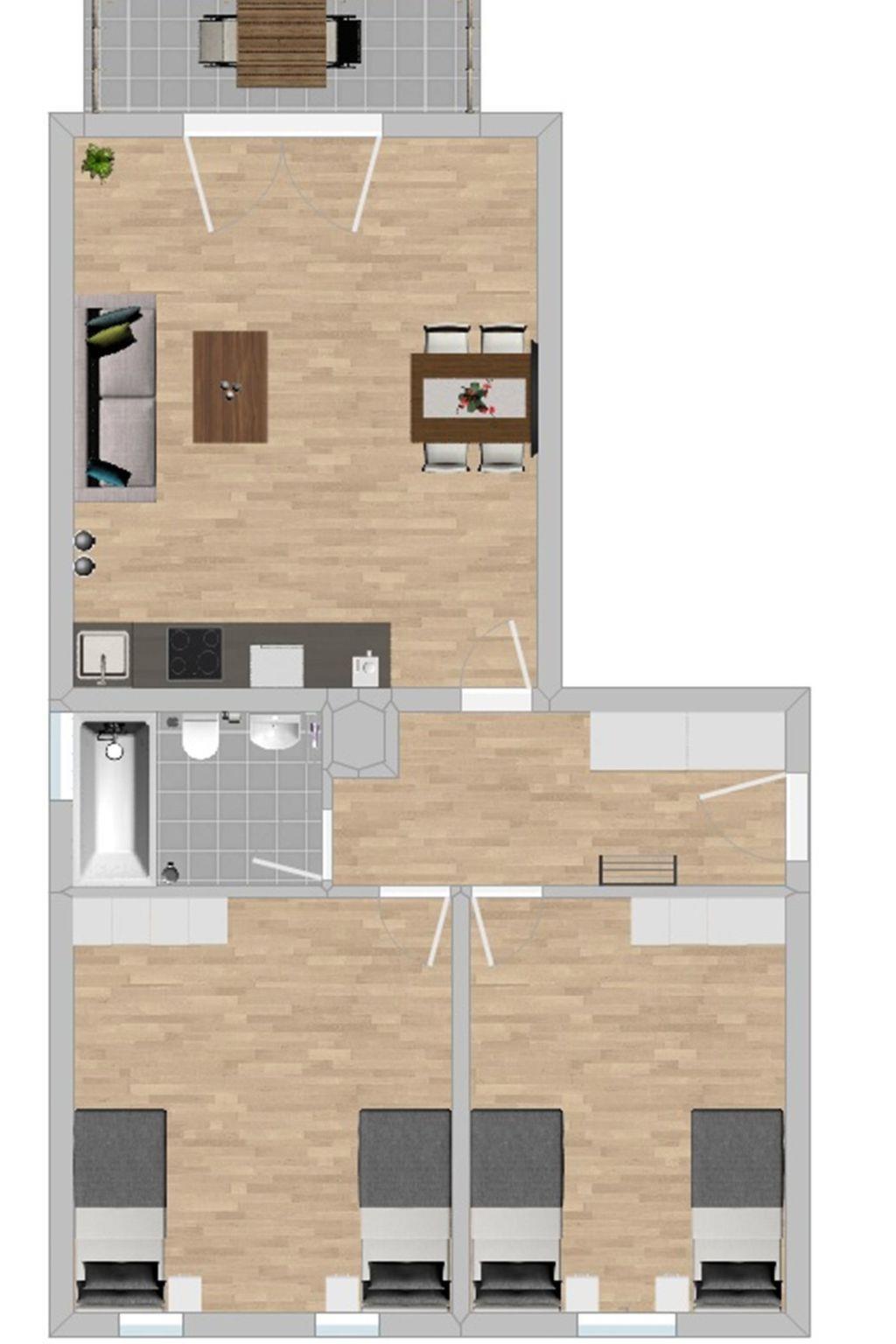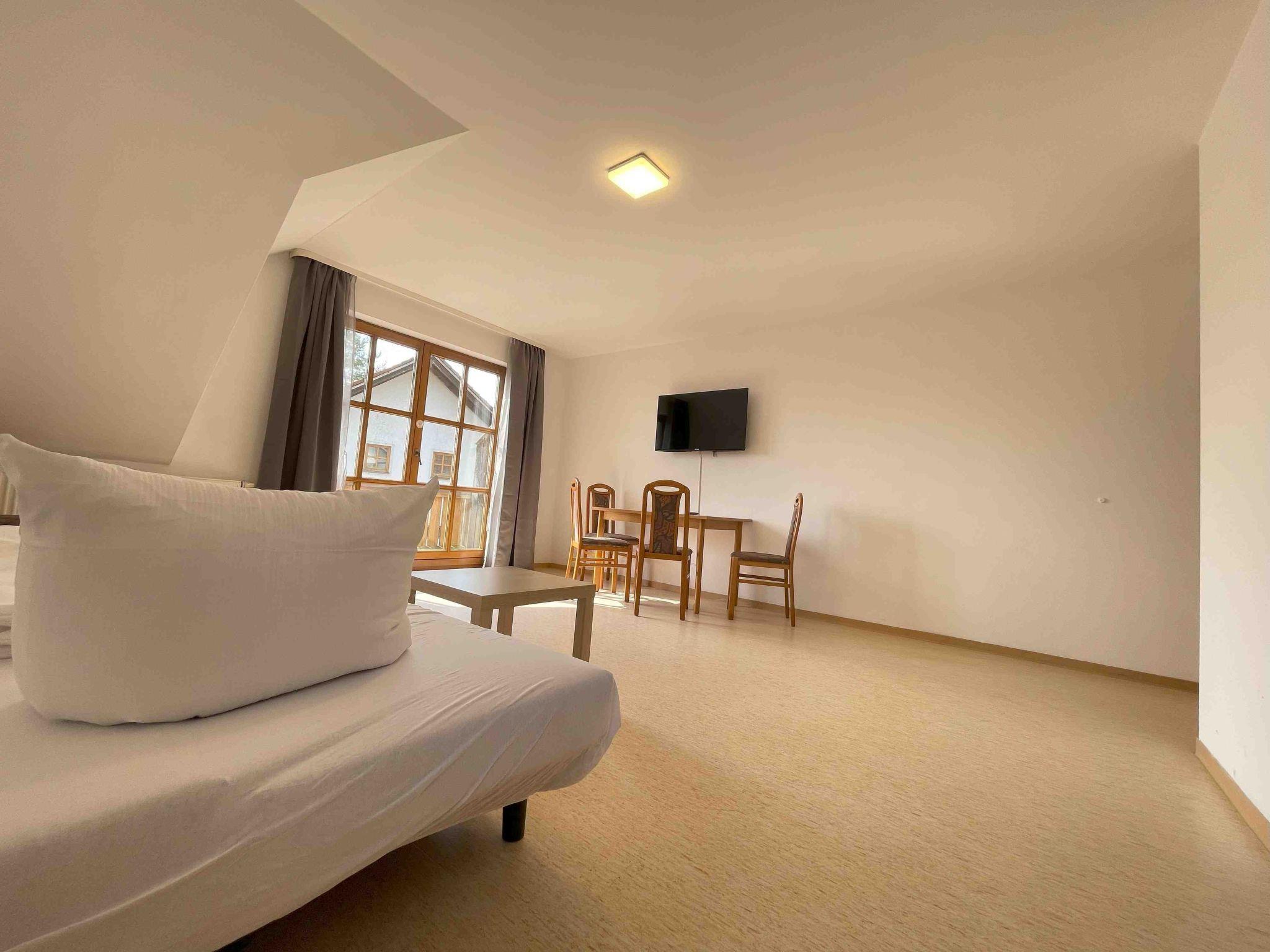 The furnished 65 m² attic flat in Stamsried has two bedrooms, each with two single beds, and is suitable for up to four people. It is possible for a fifth person to sleep on the sofa.