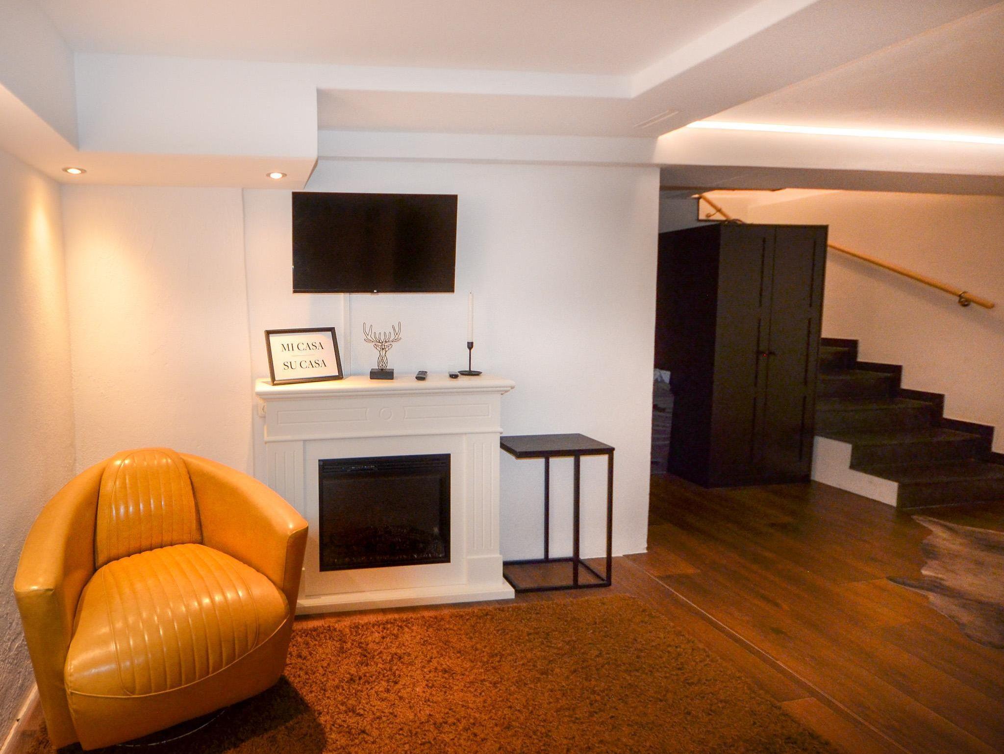 Das Wohnzimmer ist stilvoll und mit einer riesigen Wohlfühlcouch eingerichtet. Für gemütliche Stunden steht ein Kachelkamin bereit. Ein großer Fernseher mit einer tollen Soundanlage sorgt für Kinoerlebnis im Wohnbereich.