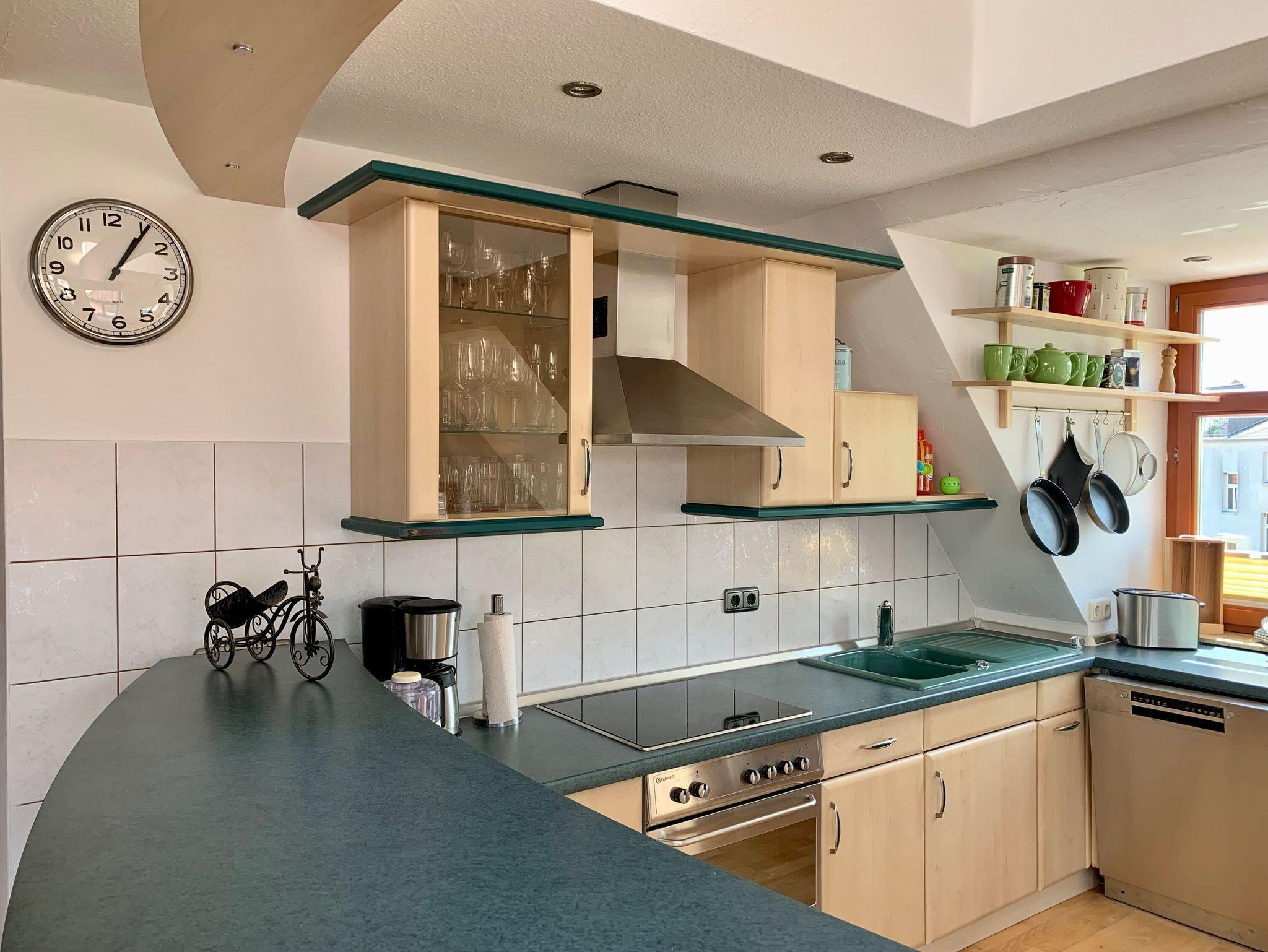 - offene Küche mit Bar, vollausgestattet mit Backofen, 4-Platten-Ceranfeld, Kühlschrank mit Gefrierfach, Wasserkocher, Kaffeemaschine, Toaster, Eierkocher