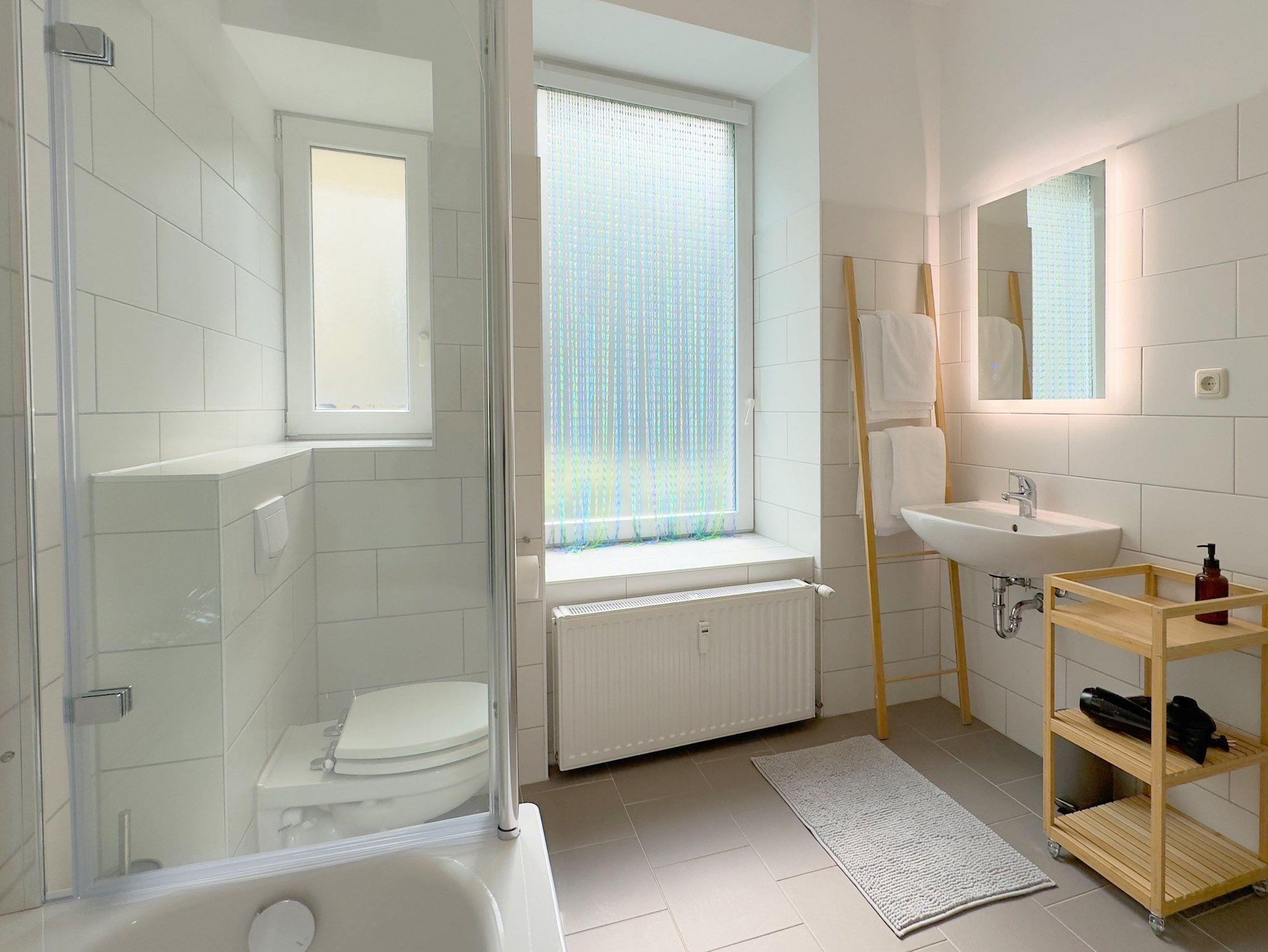• - Modernes Badezimmer mit Badewanne (mit Duschfunktion) und WC inklusive Waschmaschine mit Trocknerfunktion