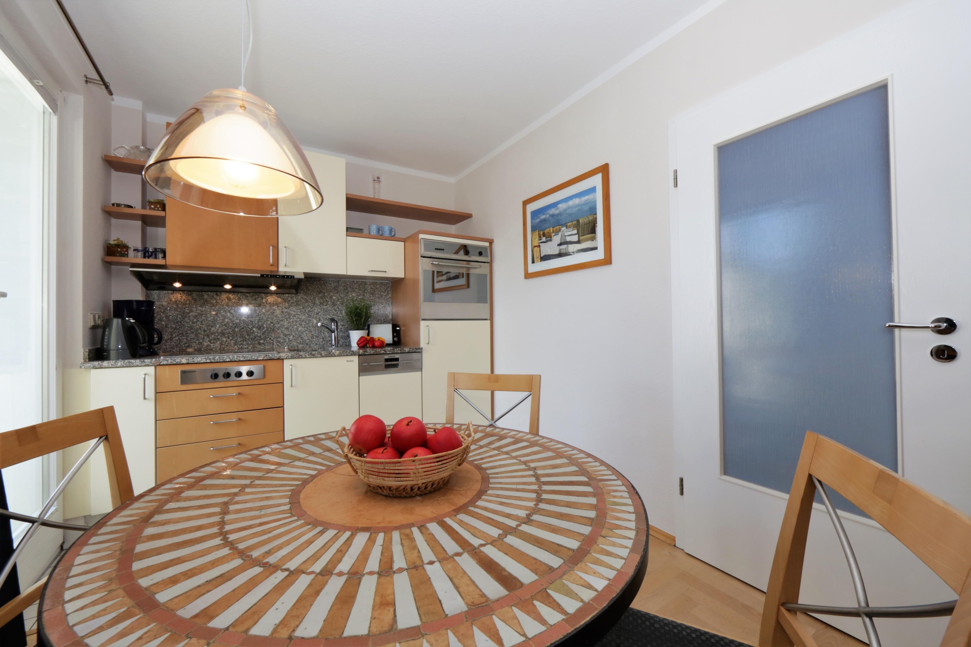 Dieses moderne 42 qm große 2-Zimmer-Appartement liegt im 2.Obergeschoss mit einem zum Süden ausgerichteten Balkon, der vom Wohnraum begehbar ist. Der gemütliche Wohnbereich ist mit einem Ecksofa mit Schlaffunktion (Matratze 160 x 200), Couchtisch und TV eingerichtet. Ihre Urlaubskarten können Sie am separaten Schreibtisch schreiben. Die Küchenzeile, ausgestattet mit Cerankochfeld, Backofen, Kühlschrank mit Gefrierfach, Geschirrspüler etc. und angrenzendem Essplatz sind offen im Wohnraum integriert. Im Schlafzimmer stehen den Gästen für einen erholsamen Schlaf ein modernes Boxspringbett mit einer durchgehenden Matratze (180 x 200) und reichlich Schrankraum zur Verfügung. Das Bad ist mit Dusche/WC und Waschtisch ausgestattet. Ein Pkw-Stellplatz befindet sich in der Tiefgarage und ist der Wohnung zugeordnet. Ein Fahrradständer steht den Gästen im Kellergeschoss ebenso zur Verfügung wie Waschmaschine und Trockner gegen Gebühr.