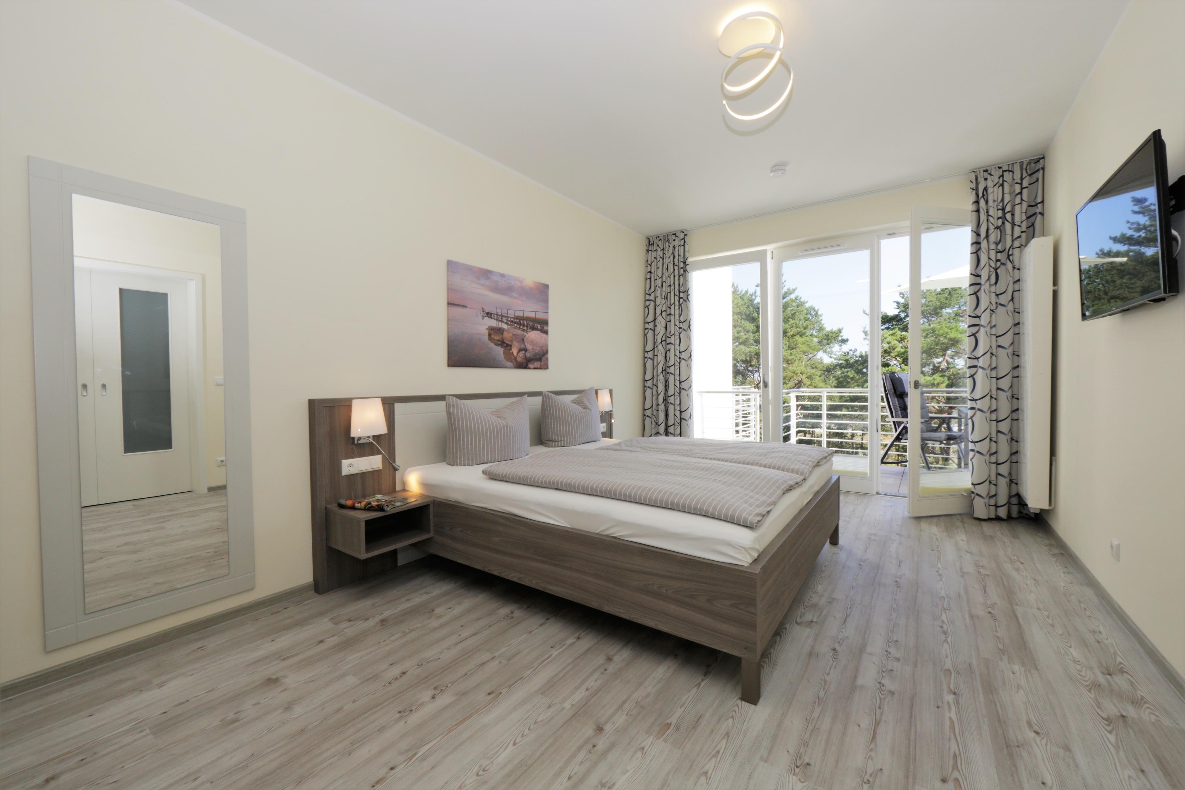 Das mit 58 qm großzügige 2-Zimmer-Appartement befindet sich im 3. OG des Hauses und bietet einen direkten Blick auf die Ostsee und den breiten von Kiefern umsäumten Strand und die Promenade. Dieses Appartement bietet 2 Personen viel Platz für einen entspannten Urlaub. Der helle Wohnraum mit großer Fensterfront ist geschmackvoll mit einer Ledergarnitur und Glastisch sowie Flat TV eingerichtet. Sowohl der gemütliche Essplatz als auch die Vollküche incl. Ceranfeld, Backofen, Mikrowelle, Kühlschrank, Geschirrspüler etc. sind im Wohnraum integriert. Das großzügig bemessene Schlafzimmer ist durch eine breite Schiebetür vom Wohnraum getrennt und mit einem Doppelbett mit getrennten Matratzen (90 x 200) , reichlich Schrankraum, Hotelsafe und einem weiteren TV eingerichtet. Der große, zur Promenade ausgerichtete möblierte Balkon ist sowohl vom Wohnzimmer als auch vom Schlafzimmer begehbar und bietet einen herrlichen Blick. Der Seeblick ist durch die Kiefern ein wenig eingeschränkt, deshalb jedoch nicht weniger interessant. Das Badezimmer verwöhnt die Gäste mit einer ebenerdigen Dusche und Waschtisch/WC.