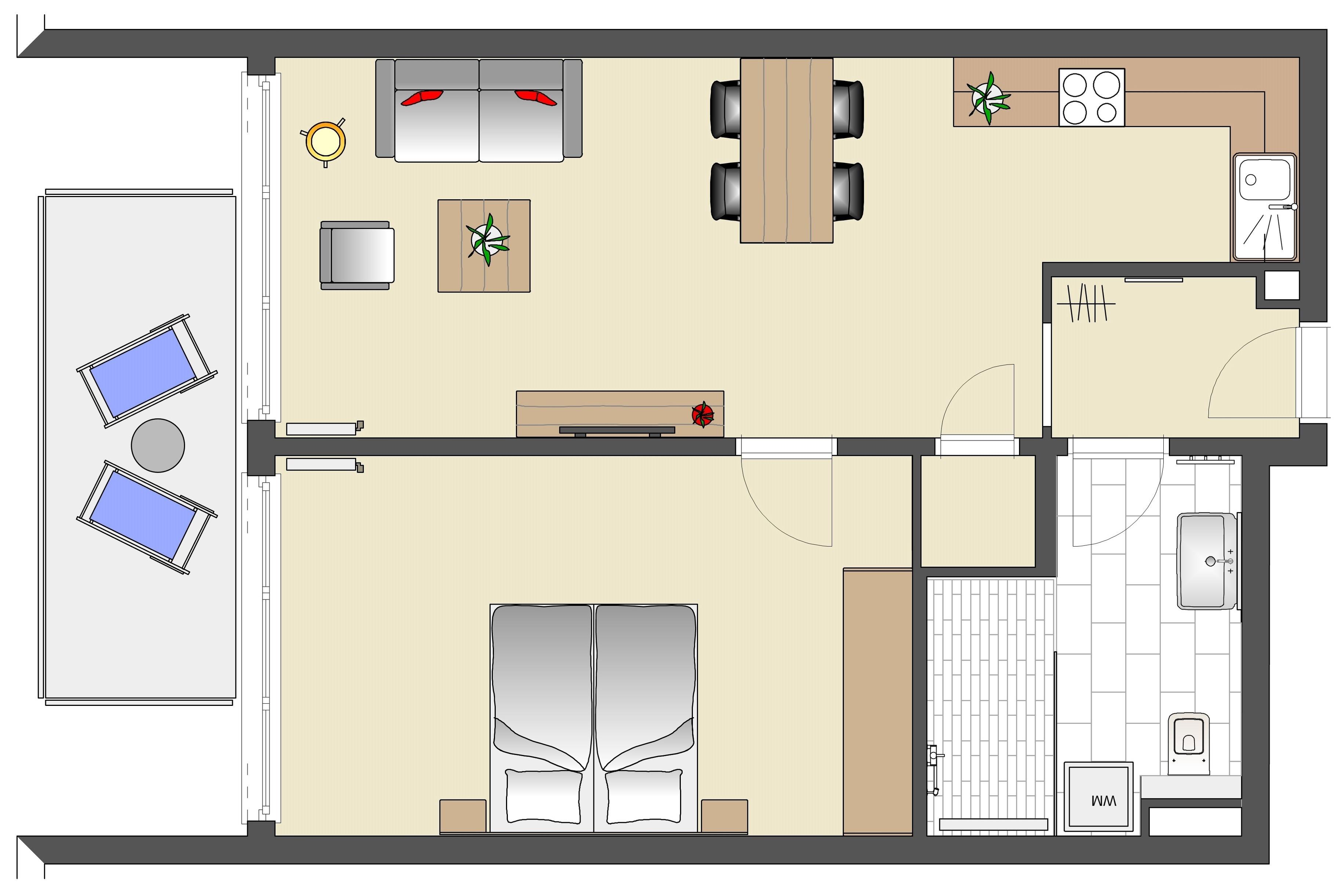 Die moderne hochwertige 2-Zimmer Ferienwohnung mit 58 m² Wohnfläche befindet sich im 1. Obergeschoss der Strandresidenz. Der überdachte Balkon zur Promenade mit traumhaftem Seeblick lockt die Gäste schon zum Frühstück ins Freie. Die Wohnung ist individuell, komfortabel und mit viel Liebe zum Detail eingerichtet. Sie bietet 2-4 Personen Platz für einen erholsamen Urlaub am Meer. Der offene Wohnraum bietet Ihnen eine gemütliche Sitzecke mit einem bequemen Ledersofa mit Schlaffunktion (Matratze 160 x 200), einen Sessel und Flat TV. Die Küchenzeile incl. Backofen, Induktionsfeld, Kühlschrank, Geschirrspüler, Mikrowelle etc. sowie der Essplatz sind offen im Wohnraum integriert. Das geräumige Schlafzimmer ist mit einem Doppelbett mit getrennten Matratzen (90 x 200), einem großen Kleiderschrank und zusätzlichem Flat TV eingerichtet. Um den Sonnenaufgang zu beobachten, müssen Sie nicht unbedingt das kuschelige Bett verlassen. Aus beiden Zimmern genießen Sie den Seeblick aus erster Hand. Der Balkon lässt sich sowohl vom Wohn- als auch vom Schlafzimmer betreten. Das großzügige, moderne Bad ist mit einer ebenerdigen Dusche und Waschtisch/WC ausgestattet.