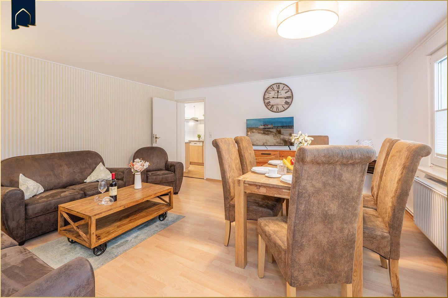 Auf großzügigen 75?m² bietet die Ferienwohnung Platz für bis zu 6 Personen. Zwei gemütliche Schlafzimmer, ein heller Wohnbereich mit Sofaecke sowie zwei moderne Badezimmer mit Dusche sorgen für Privatsphäre und Entspannung. Die voll ausgestattete Küche mit Herd, Backofen, Geschirrspüler, Kühlschrank, Mikrowelle und Kaffeemaschine lässt keine Wünsche offen – ideal für Selbstversorger. Zur Unterhaltung stehen ein Flachbild-TV, Radio, CD-Player und verschiedene Spiele zur Verfügung. Die hochwertige Ausstattung mit Bodenbelägen, Kommoden, Spiegeln und vielen liebevollen Details schafft eine einladende Wohlfühlatmosphäre.