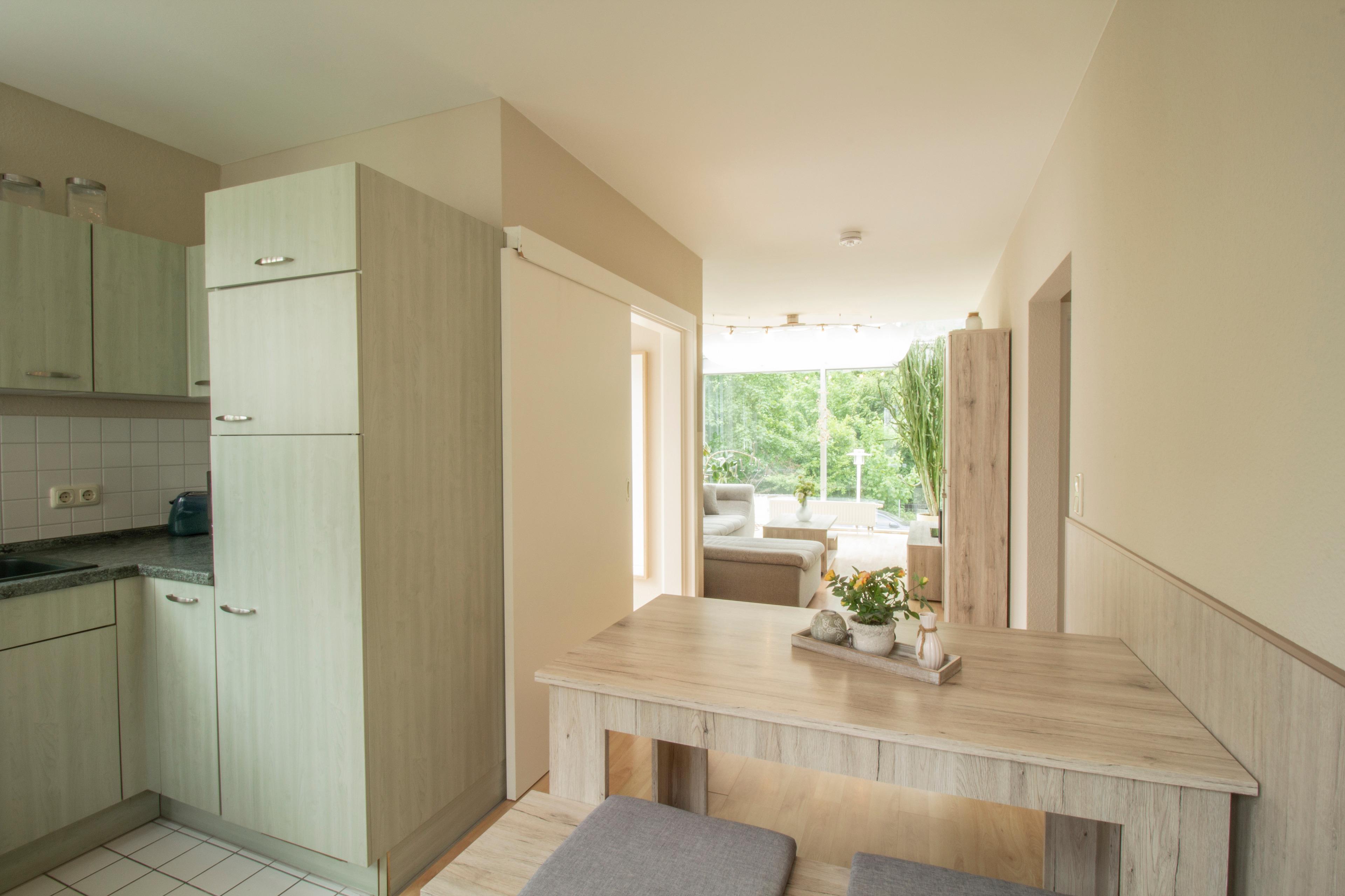 Diese gemütliche 3-Raum-Wohnung liegt im 1. Obergeschoß mit einen sonnigen Balkon in Richtung Buchenwald. Im Wohnbereich befinden sich eine Couchecke, Couchtisch und TV. Die an den Wohnbereich angrenzende Küche ist mit einem Essplatz eingerichtet und verfügt über Herd mit Backofen, Kühlschrank mit Gefrierfach, Mikrowelle, Geschirrspüler etc. Beide Schlafzimmer sind mit einem Boxspringbett (180 x 200) sowie einem Kleiderschrank möbliert. Das Bad ist mit einer Dusche und Waschtisch/WC ausgestattet. Ein Pkw-Stellplatz steht Ihnen auf dem Grundstück zur Verfügung.