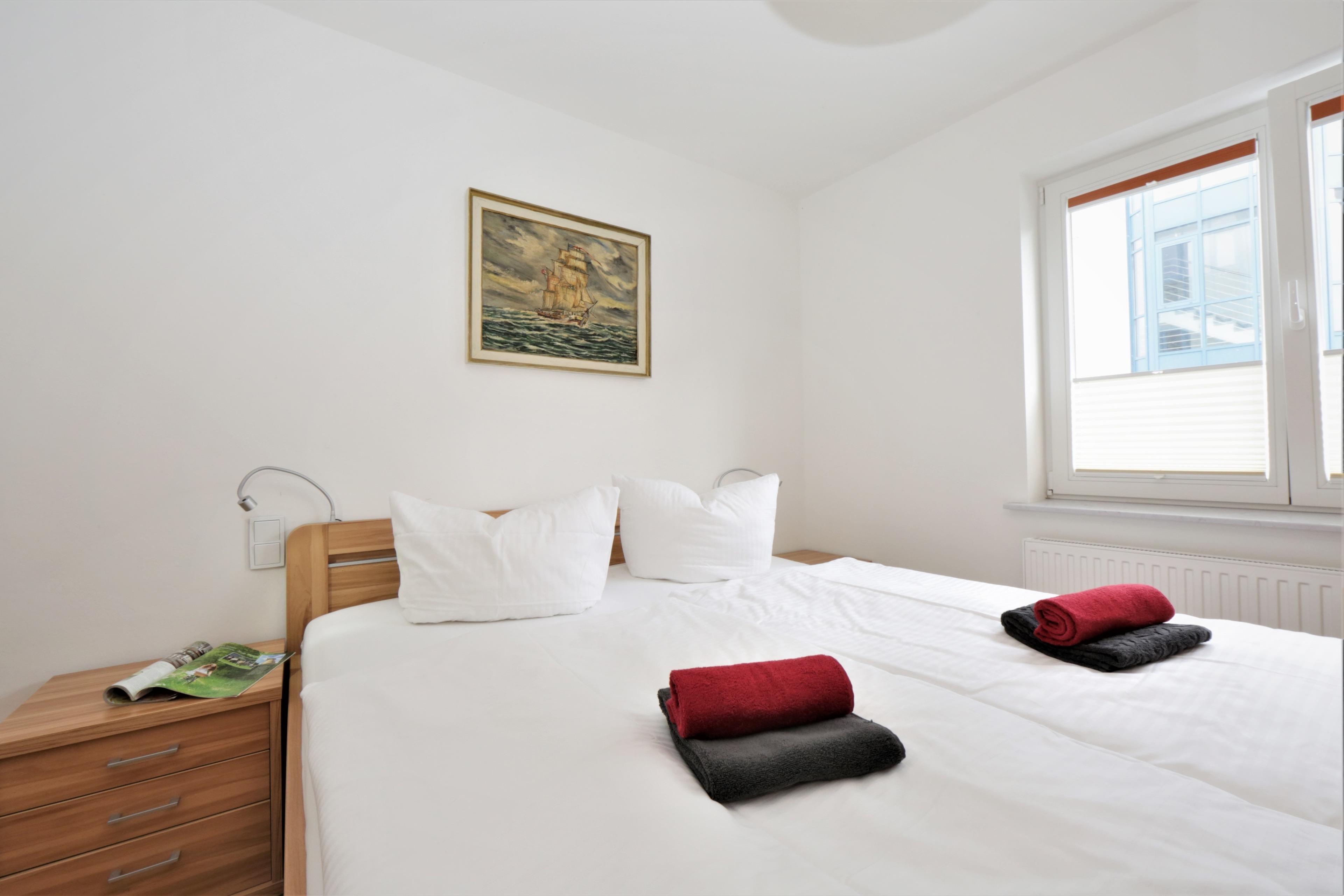 Der zweckmäßig und komfortabel eingerichtete Wohnraum verfügt über eine gemütliche Sitzecke und einen separaten Essplatz. Eine im Wohnbereich integrierte Küchenzeile mit Geschirrspüler, Backofen, Mikrowelle p.p lässt auch für den Hobbykoch keine Wünsche offen. Das Schlafzimmer ist mit einem Doppelbett (getrennte Matratzen je 90 x 200) und genügend Schrankraum ausgestattet. Ein Duschbad sowie ein Balkon zur Südseite runden diese Wohnung ab. Der Pkw-Stellplatz befindet sich in der Tiefgarage und ist der Wohnung zugeordnet. Fahrräder können im Keller untergestellt werden.