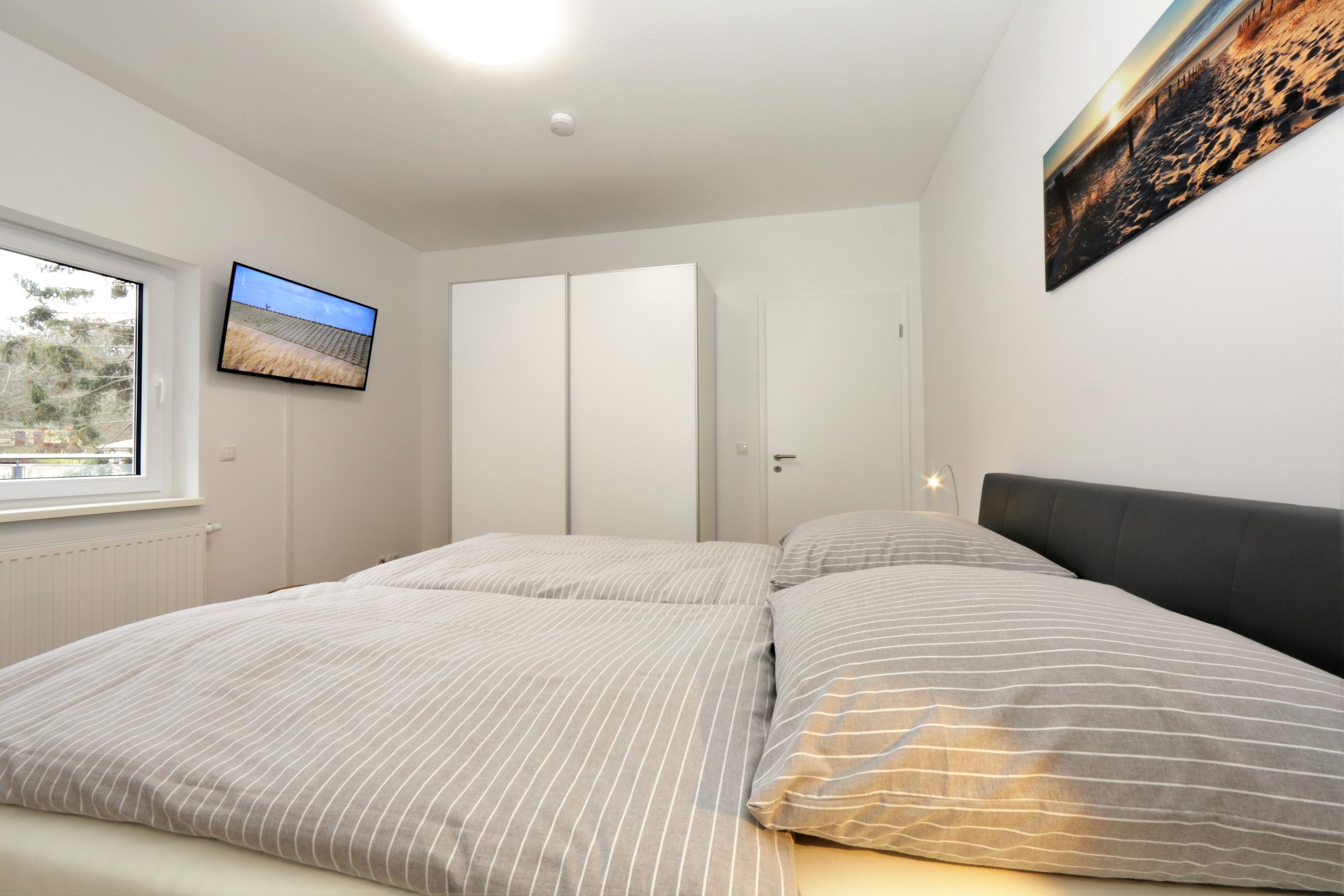 Dieses exklusive und mit seinen 115 qm großzügige 3-Zimmer Appartement im 3. Obergeschoss erreichen Sie über den Fahrstuhl. Die modern eingerichtete Wohnung ist für 4 Personen geeignet. Der große offene und helle Wohnraum ist geschmackvoll mit hochwertigen Echtholzmöbeln eingerichtet und bietet den Gästen eine gemütliche Sitzgruppe und einen großen Flat TV zum Relaxen. In einem separaten Lesesessel am Fenster können Sie Ihre Urlaubslektüre genießen. Der Esstisch für 6 Personen ist ebenfalls im Wohnraum integriert und lädt zu gemeinsamen Mahlzeiten ein. Die moderne offene Küche bietet viel Platz und ist mit Induktionskochfeld, Backofen, Geschirrspüler und Kühlschrank mit Gefrierfach ausgestattet. Der südlich ausgerichtete Balkon verläuft über die gesamte Wohnungsbreite und lockt die Gäste zu jeder Tageszeit ins Freie. Hier finden Sie immer ein windgeschütztes oder sonniges Plätzchen. Beide Schlafzimmer sind jeweils mit einem komfortablen Boxspringbett mit getrennten Matratzen (90 x 200) und einem Kleiderschrank eingerichtet. In einem der beiden Schlafzimmer kann ein zweiter TV genutzt werden. Die Fußböden der Wohn- und die Schlafräume sind mit Echtholzparkett belegt. Das großzügige und moderne Badezimmer ist mit einer ebenerdigen Echtglasdusche und Waschbecken/ WC ausgestattet. Außerdem steht den Gästen eine Waschmaschine und eine Gästetoilette mit Waschbecken zur Verfügung.