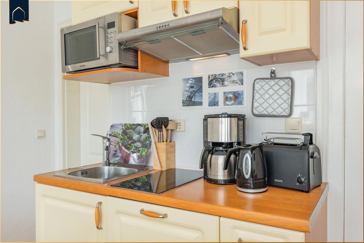 Der offen gestaltete Wohn- und Essbereich lädt zum Entspannen ein. Hier finden Sie eine voll ausgestattete Küche, einen Esstisch sowie eine gemütliche Sofaecke – ideal, um nach einem aktiven Tag auf der Insel zur Ruhe zu kommen. Die gesamte Wohnung ist Nichtraucherbereich, allergikergeeignet und mit Fußbodenheizung ausgestattet, sodass Sie sich das ganze Jahr über wohlfühlen können.