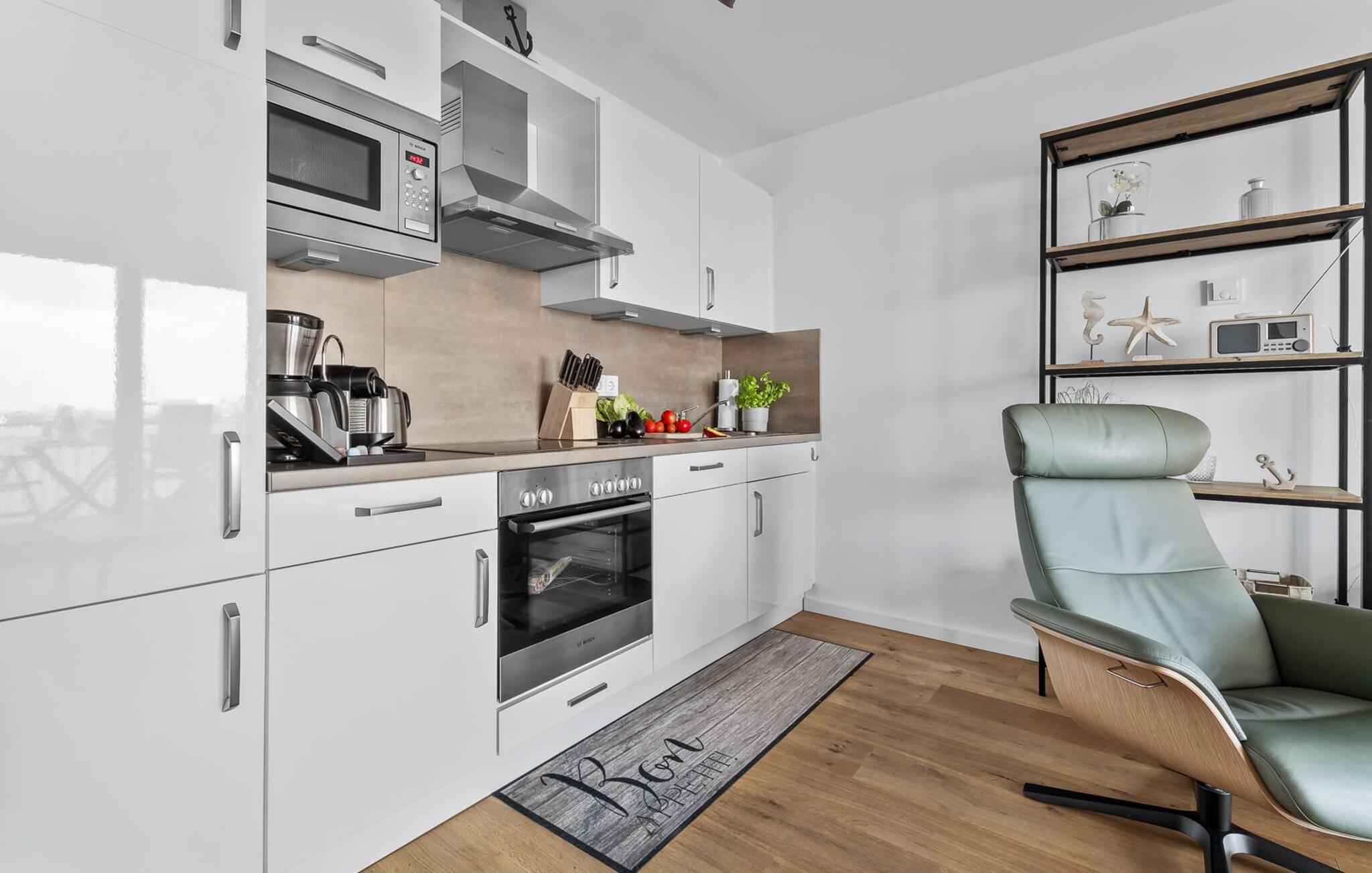 Det välutrustade köket med öppen planlösning lämnar inget övrigt att önska. Här kan du trolla fram läckra semestermåltider eller ett utsökt kaffe med nyvispad mjölk. Balkongen inbjuder till grillning med utsikt över vattnet.
