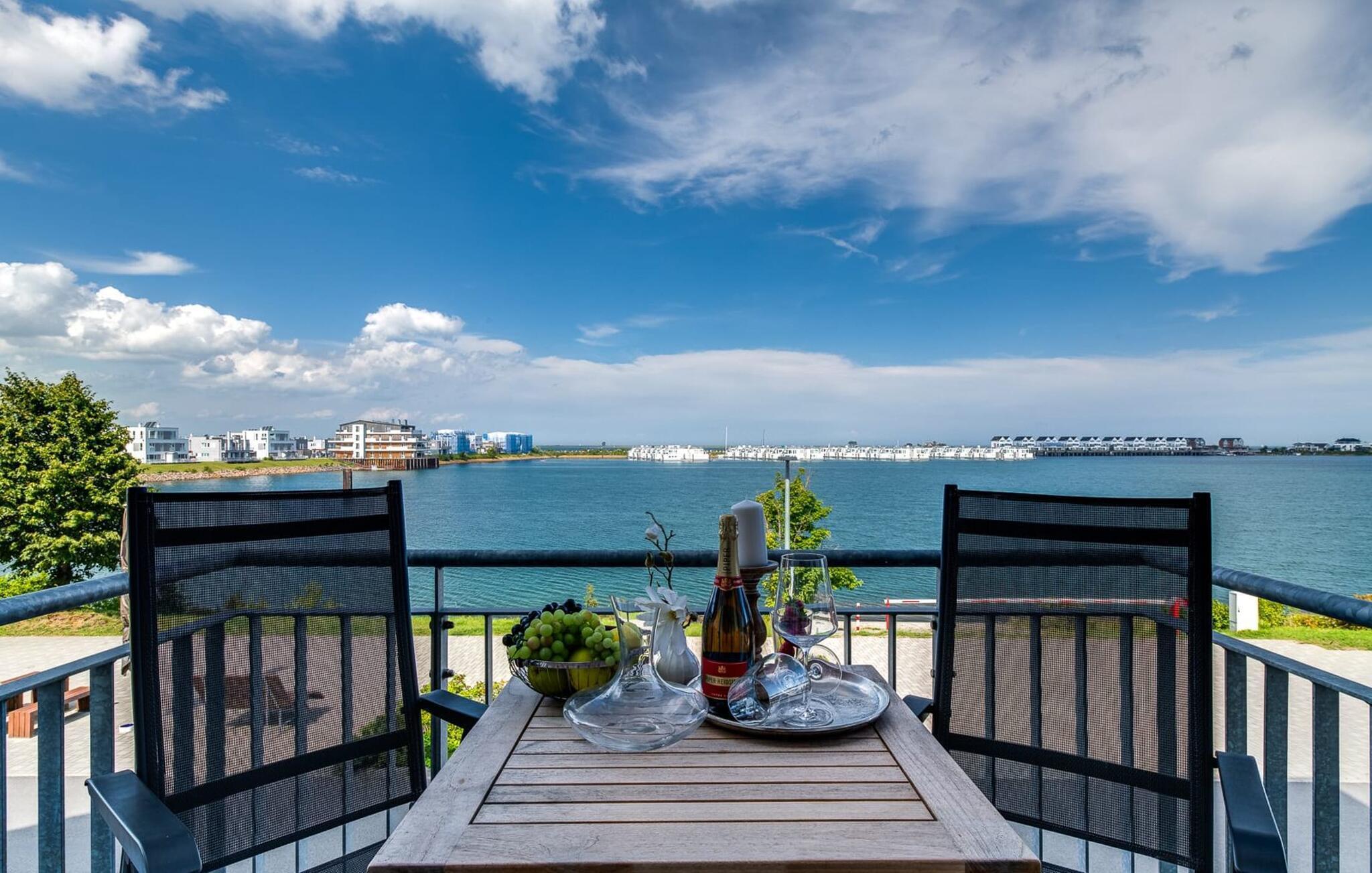 Utsikten faller på de flytande husen och Östersjöfjorden Schlei med förbipasserande segelfartyg och Schleimünde-fyren. Hamnbio är garanterat, liksom de bildsköna solnedgångarna som kan ses från balkongen.