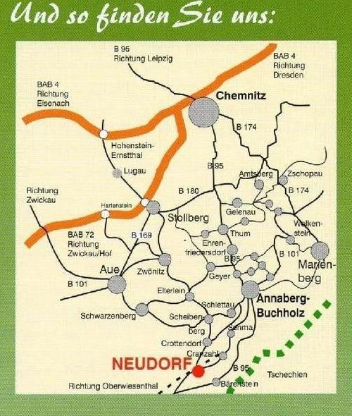 Unser Feriendomizil befindet sich im anerkannten Erholungsort Neudorf welches zwischen der Bergstadt Annaberg-Buchholz ca. 12 km und dem Winterkurort Oberwiesenthal ca. 10 km liegt.