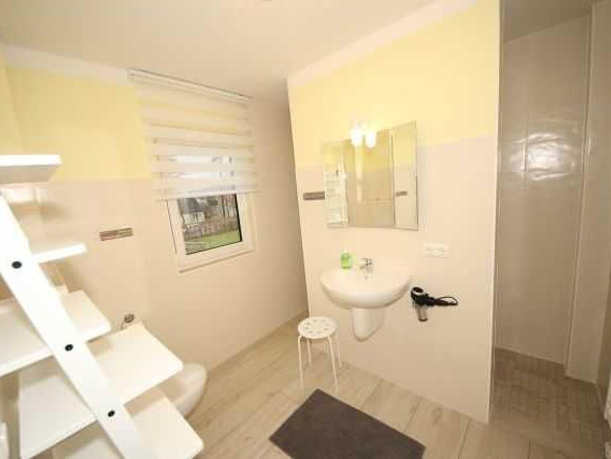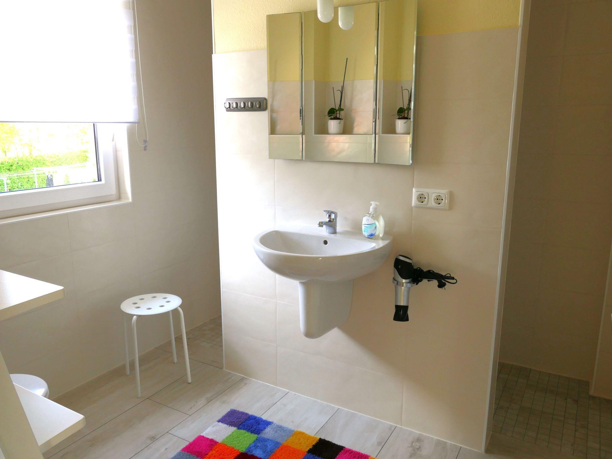 Im Bad finden Sie eine bodenebene Dusche, die von beiden Seiten begehbar ist, einen beheizten Handtuchtrockner, Fön, WC und einen Waschtisch. Für warme Füße sorgt die Fußbodenheizung im gesamten Appartement.